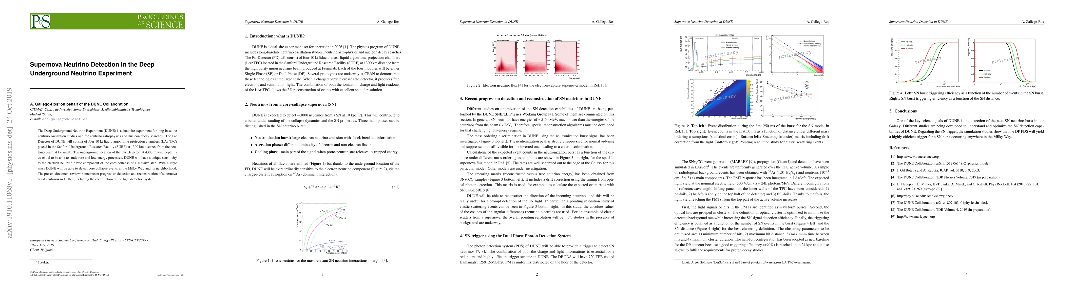 The Deep Underground Neutrino Experiment (DUNE) is a dual-site experiment for long-baseline neutrino oscillation studies and for neutrino astrophysics and nucleon decay searches. The Far Detector of DUNE will consist of four 10 kt liquid argon time-projection-chambers (LAr TPC) placed in the Sanford Underground Research Facility (SURF) at 1300 km distance from the neutrino beam at Fermilab. The underground location of the Far Detector, at 4300 m.w.e. depth, is essential to be able to study rare and low-energy processes. DUNE will have a unique sensitivity to the electron neutrino flavor component of the core collapse of a massive star. With a large mass DUNE will be able to detect core collapse events in the Milky Way and its neighborhood. The present document reviews some recent progress on detection and reconstruction of supernova burst neutrinos in DUNE, including the contribution of the light detection system.