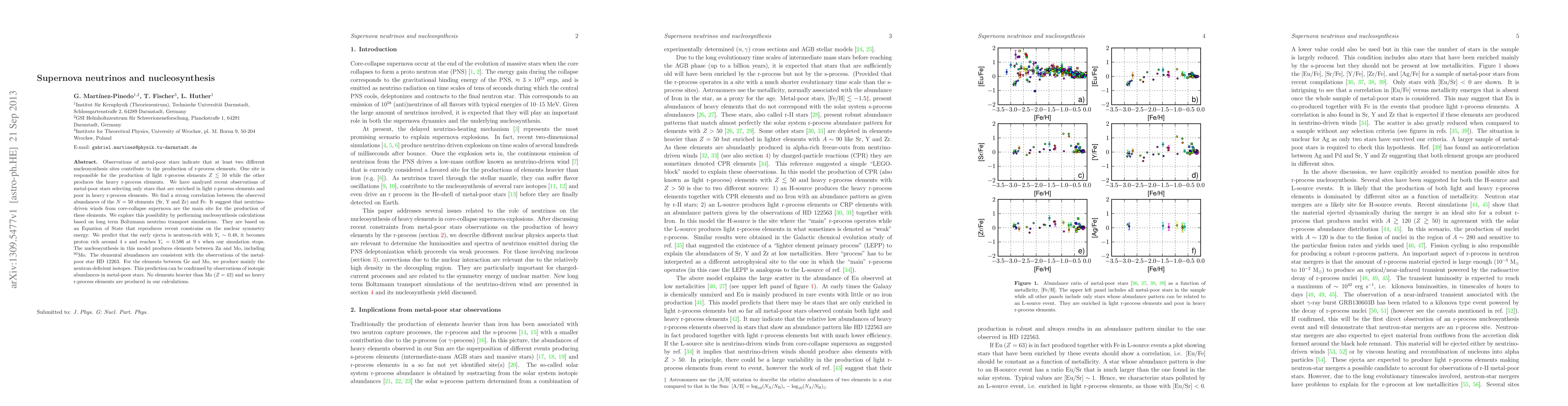 Observations of metal-poor stars indicate that at least two different nucleosynthesis sites contribute to the production of r-process elements. One site is responsible for the production of light r-process elements Z<~50 while the other produces the heavy r-process elements. We have analyzed recent observations of metal-poor stars selecting only stars that are enriched in light r-process elements and poor in heavy r-process elements. We find a strong correlation between the observed abundances of the N=50 elements (Sr, Y and Zr) and Fe. It suggest that neutrino-driven winds from core-collapse supernova are the main site for the production of these elements. We explore this possibility by performing nucleosynthesis calculations based on long term Boltzmann neutrino transport simulations. They are based on an Equation of State that reproduces recent constrains on the nuclear symmetry energy. We predict that the early ejecta is neutron-rich with Ye ~ 0.48, it becomes proton rich around 4 s and reaches Ye = 0.586 at 9 s when our simulation stops. The nucleosynthesis in this model produces elements between Zn and Mo, including 92Mo. The elemental abundances are consistent with the observations of the metal-poor star HD 12263. For the elements between Ge and Mo, we produce mainly the neutron-deficient isotopes. This prediction can be confirmed by observations of isotopic abundances in metal-poor stars. No elements heavier than Mo (Z=42) and no heavy r-process elements are produced in our calculations.