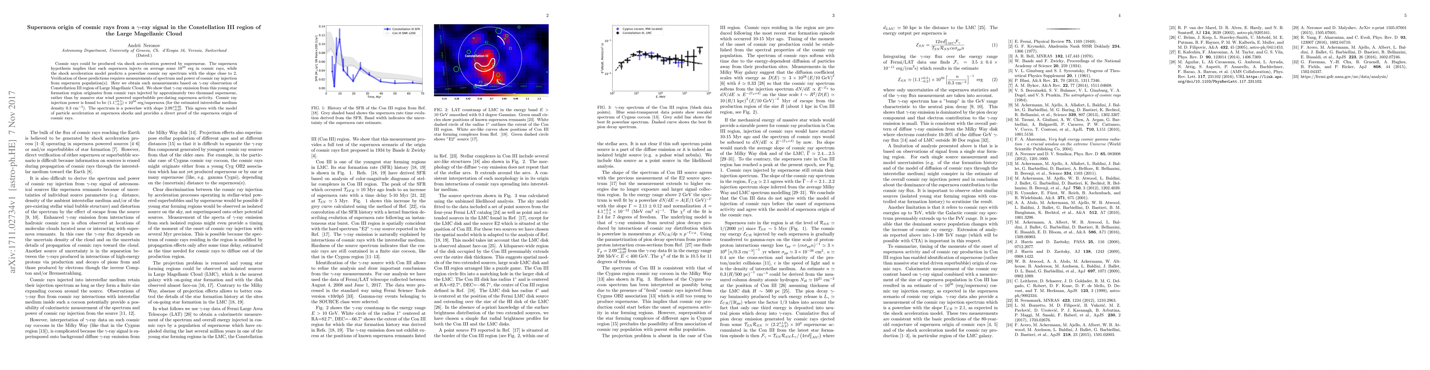 This paper confirms that cosmic rays in the Constellation III region of the Large Magellanic Cloud are primarily produced by supernovae, with gamma-ray observations revealing a powerlaw spectrum consistent with shock acceleration models. The study estimates the cosmic ray injection power per supernova to be around 1e50 erg, supporting the supernova origin hypothesis.
