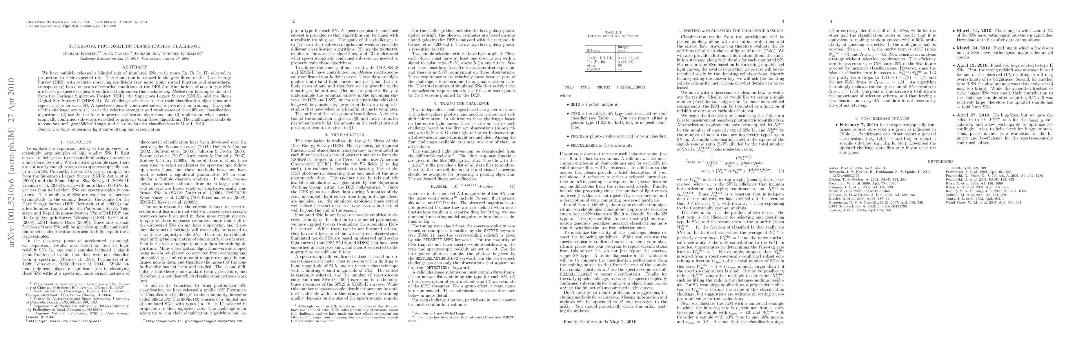 This research paper presents a supernova classification challenge featuring a mix of simulated supernovae types (Ia, Ib, Ic, II) observed in the griz filters of the Dark Energy Survey, aiming to evaluate the performance of various classification algorithms. The challenge seeks to identify strengths and weaknesses in these algorithms and to determine the necessary spectroscopically confirmed subsets for effective training.