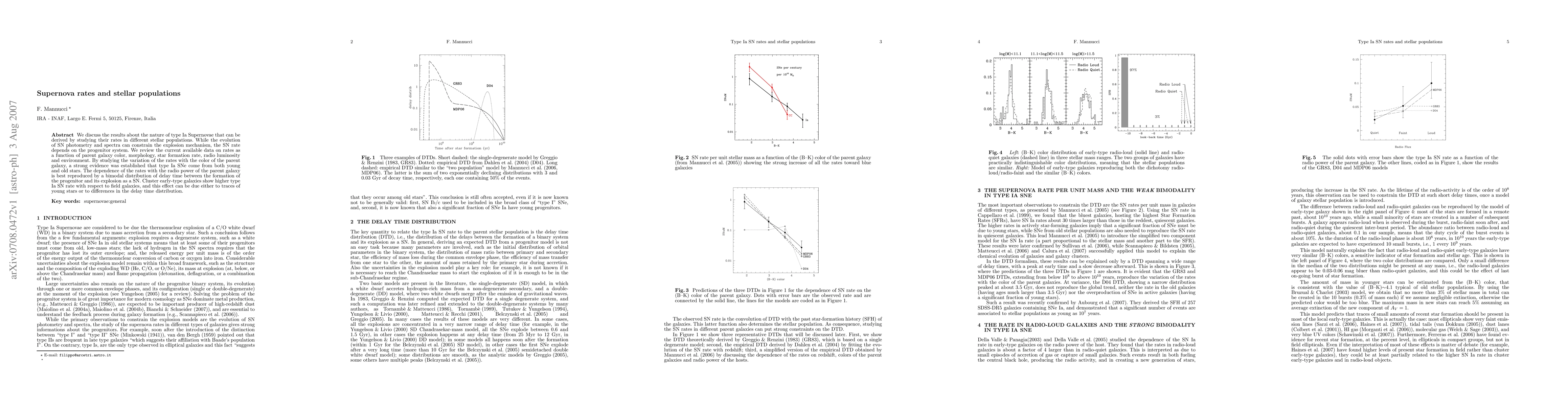 We discuss the results about the nature of type Ia Supernovae that can be derived by studying their rates in different stellar populations. While the evolution of SN photometry and spectra can constrain the explosion mechanism, the SN rate depends on the progenitor system. We review the current available data on rates as a function of parent galaxy color, morphology, star formation rate, radio luminosity and environment. By studying the variation of the rates with the color of the parent galaxy, a strong evidence was established that type Ia SNe come from both young and old stars. The dependence of the rates with the radio power of the parent galaxy is best reproduced by a bimodal distribution of delay time between the formation of the progenitor and its explosion as a SN. Cluster early-type galaxies show higher type Ia SN rate with respect to field galaxies, and this effect can be due either to traces of young stars or to differences in the delay time distribution.