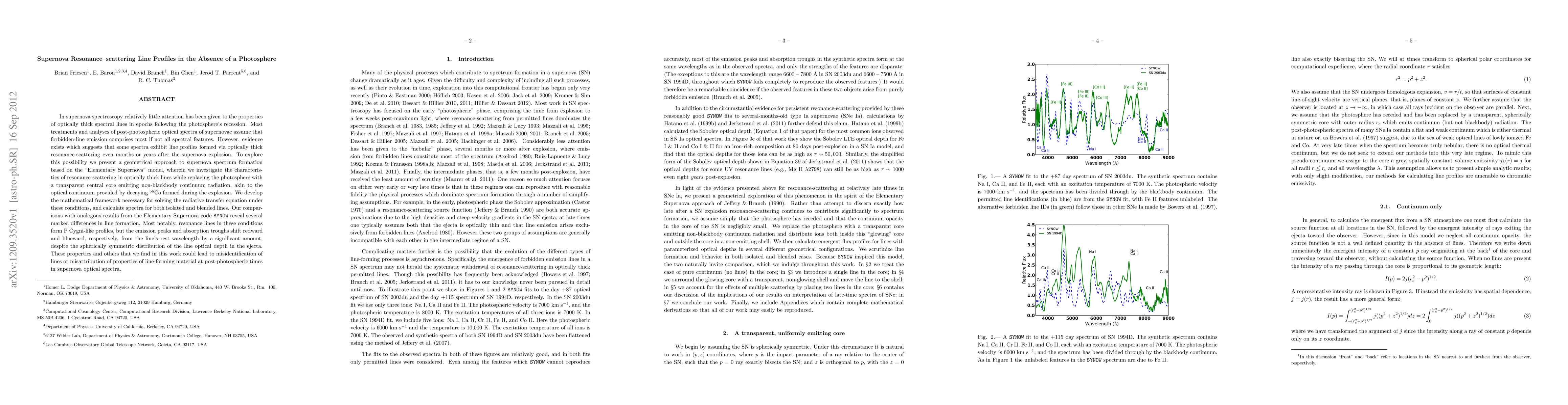 In supernova spectroscopy relatively little attention has been given to the properties of optically thick spectral lines in epochs following the photosphere's recession. Most treatments and analyses of post-photospheric optical spectra of supernovae assume that forbidden-line emission comprises most if not all spectral features. However, evidence exists which suggests that some spectra exhibit line profiles formed via optically thick resonance-scattering even months or years after the supernova explosion. To explore this possibility we present a geometrical approach to supernova spectrum formation based on the "Elementary Supernova" model, wherein we investigate the characteristics of resonance-scattering in optically thick lines while replacing the photosphere with a transparent central core emitting non-blackbody continuum radiation, akin to the optical continuum provided by decaying 56Co formed during the explosion. We develop the mathematical framework necessary for solving the radiative transfer equation under these conditions, and calculate spectra for both isolated and blended lines. Our comparisons with analogous results from the Elementary Supernova code SYNOW reveal several marked differences in line formation. Most notably, resonance lines in these conditions form P Cygni-like profiles, but the emission peaks and absorption troughs shift redward and blueward, respectively, from the line's rest wavelength by a significant amount, despite the spherically symmetric distribution of the line optical depth in the ejecta. These properties and others that we find in this work could lead to misidentification of lines or misattribution of properties of line-forming material at post-photospheric times in supernova optical spectra.