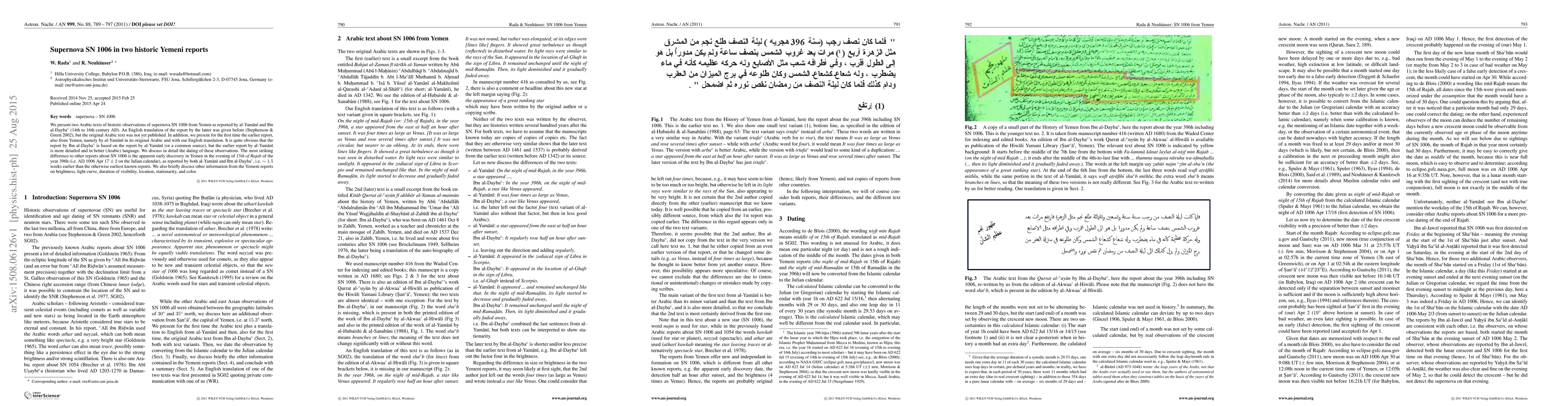 This paper presents two Arabic texts of historic observations of supernova SN 1006 from Yemen, detailing reports by al-Yamani and Ibn al-Dayba. The study includes the first publication of al-Yamani's original Arabic text and translation, revealing an earlier and more detailed discovery of SN 1006 in Yemen, approximately 1.5 weeks before other known reports.