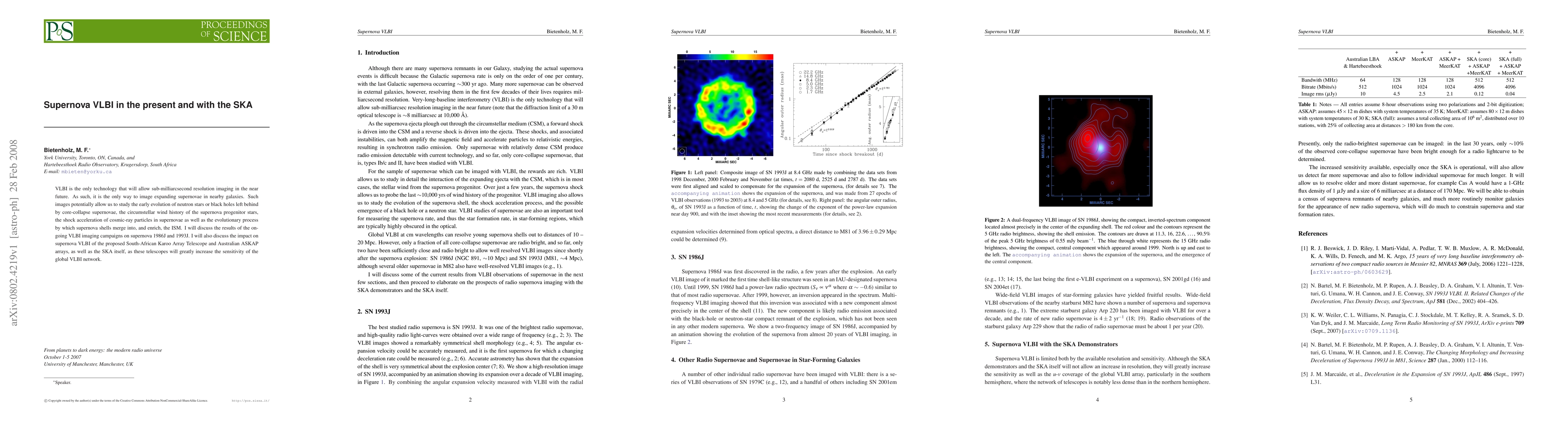 VLBI is the only technology that will allow sub-milliarcsecond resolution imaging in the near future. As such, it is the only way to image expanding supernovae in nearby galaxies. Such images potentially allow us to study the early evolution of neutron stars or black holes left behind by core-collapse supernovae, the circumstellar wind history of the supernova progenitor stars, the shock acceleration of cosmic-ray particles in supernovae as well as the evolutionary process by which supernova shells merge into, and enrich, the ISM. I will discuss the results of the on-going VLBI imaging campaigns on supernovae 1986J and 1993J. I will also discuss the impact on supernova VLBI of the proposed South-African Karoo Array Telescope and Australian ASKAP arrays, as well as the SKA itself, as these telescopes will greatly increase the sensitivity of the global VLBI network.