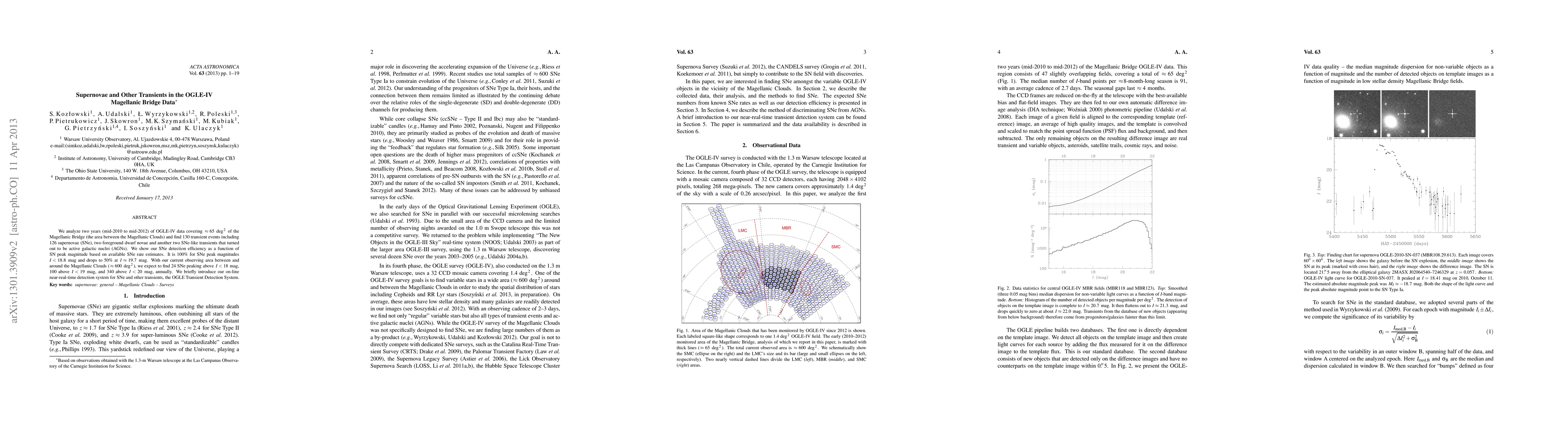 We analyze two years (mid-2010 to mid-2012) of OGLE-IV data covering ~65 deg^2 of the Magellanic Bridge (the area between the Magellanic Clouds) and find 130 transient events including 126 supernovae (SNe), two foreground dwarf novae and another two SNe-like transients that turned out to be active galactic nuclei (AGNs). We show our SNe detection efficiency as a function of SN peak magnitude based on available SNe rate estimates. It is 100% for SNe peak magnitudes I<18.8 mag and drops to 50% at I=~19.7 mag. With our current observing area between and around the Magellanic Clouds (~600 deg^2), we expect to find 24 SNe peaking above I<18 mag, 100 above I<19 mag, and 340 above I<20 mag, annually. We briefly introduce our on-line near-real-time detection system for SNe and other transients, the OGLE Transient Detection System.