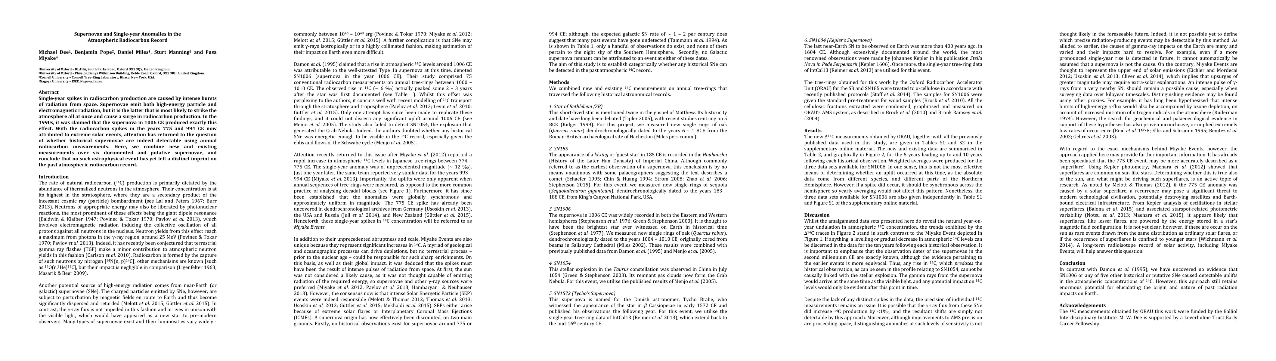 This paper investigates the potential impact of historical supernovae on atmospheric radiocarbon (14C) levels, finding no distinct imprint from six documented and putative supernovae, despite earlier claims about the 1006 CE supernova. It concludes that no single-year anomalies in the 14C record can be attributed to these events.