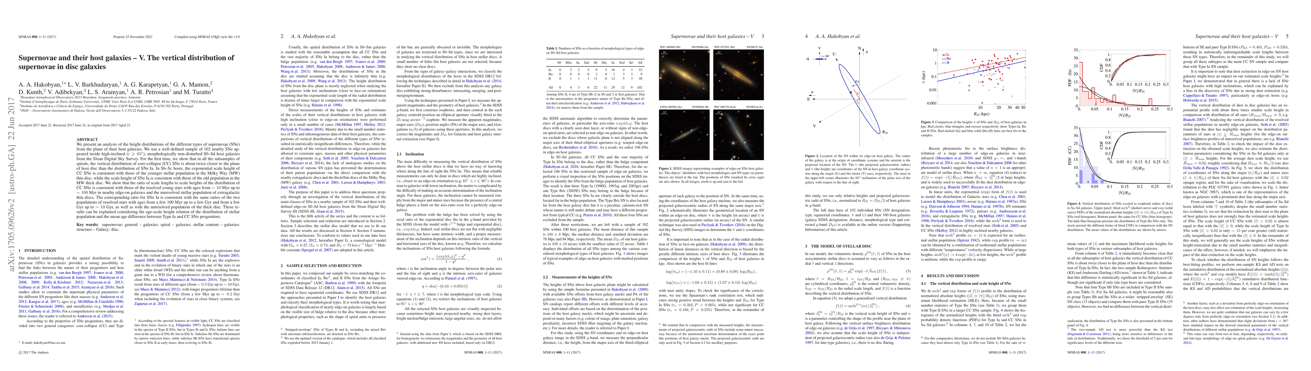 This paper analyzes the vertical distribution of supernovae in disc galaxies, finding that core-collapse supernovae are closer to the galactic plane than Type Ia supernovae. The study shows that the vertical distribution of core-collapse supernovae correlates with younger stellar populations, while Type Ia supernovae align with older populations, suggesting an age-scale height relationship.