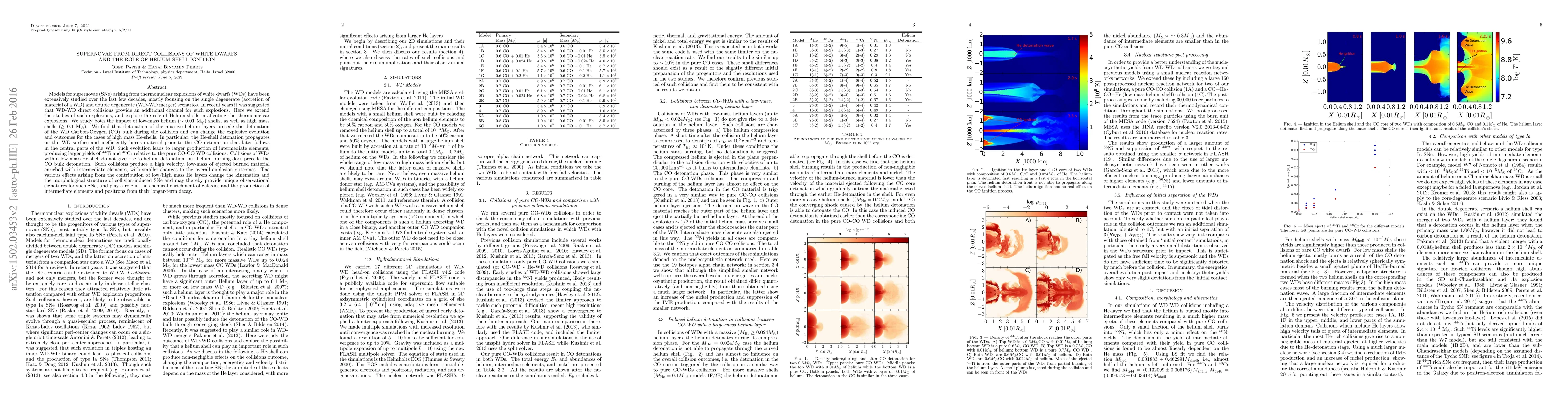 This paper investigates supernovae from direct collisions of white dwarfs, focusing on the impact of helium-shell ignition. It finds that high-mass helium shells can lead to detonation before carbon-oxygen core detonation, altering explosion dynamics and increasing yields of intermediate elements like $^{44}$Ti and $^{48}$Cr. Low-mass helium shells result in helium burning before core detonation but without detonation, leading to a high-velocity, low-mass ejecta enriched with intermediate elements.