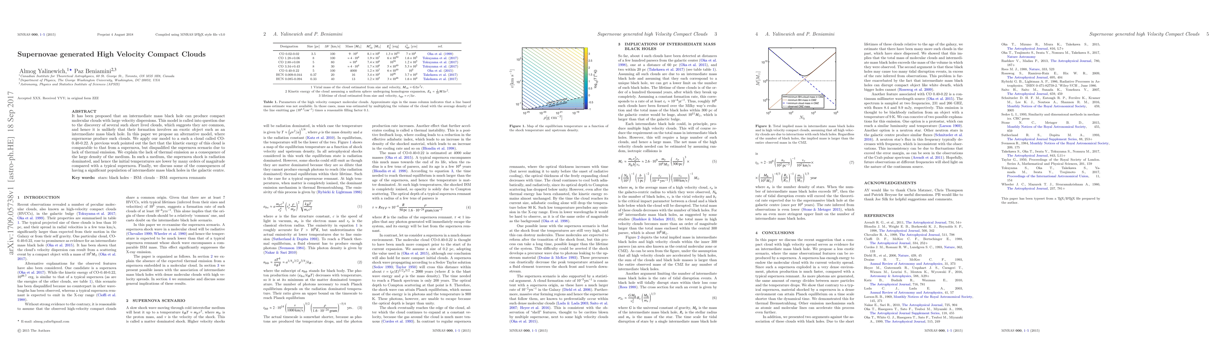 The paper proposes an alternative model to an intermediate mass black hole scenario for the formation of high velocity compact molecular clouds, attributing their origin to supernovae. It uses Sedov-Taylor solutions to model the shock wave propagation and Planck equilibrium to describe the radiative cooling in dense environments.