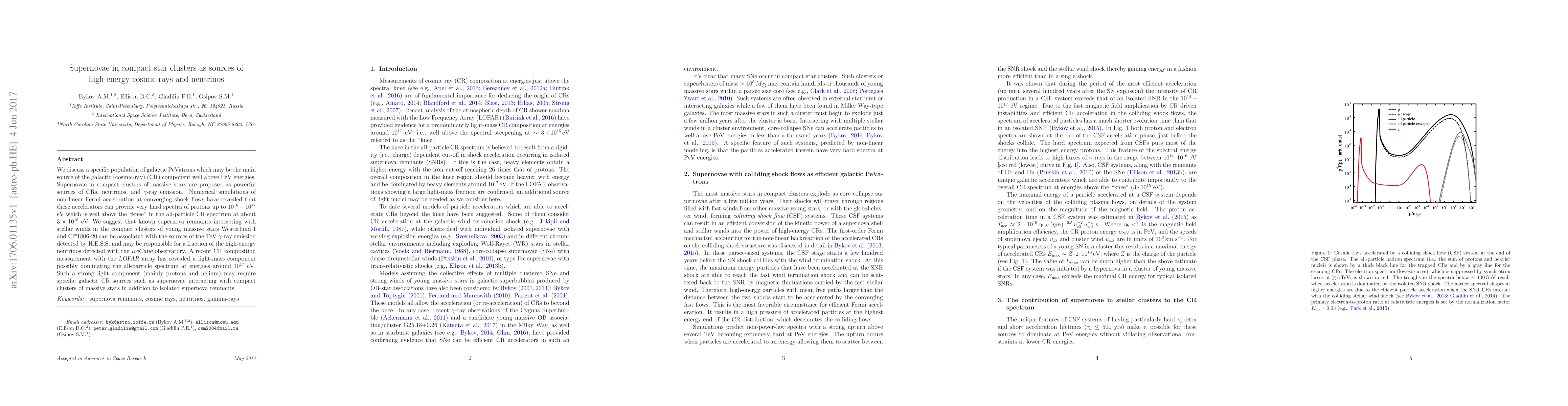 We discuss a specific population of galactic PeVatrons which may be the main source of the galactic cosmic-ray (CR) component well above PeV energies. Supernovae in compact clusters of massive stars are proposed as powerful sources of CRs, neutrinos, and gamma-ray emission. Numerical simulations of non-linear Fermi acceleration at converging shock flows have revealed that these accelerators can provide very hard spectra of protons up to $10^{16}-10^{17}$ eV which is well above the "knee" in the all-particle CR spectrum at about $3\times10^{15}$ eV. We suggest that known supernova remnants interacting with stellar winds in the compact clusters of young massive stars Westerlund I and Cl*1806-20 can be associated with the sources of the TeV gamma-ray emission detected by H.E.S.S. and may be responsible for a fraction of the high-energy neutrinos detected with the IceCube observatory. A recent CR composition measurement with the LOFAR array has revealed a light-mass component possibly dominating the all-particle spectrum at energies around $10^{17}$ eV. Such a strong light component (mainly protons and helium) may require specific galactic CR sources such as supernovae interacting with compact clusters of massive stars in addition to isolated supernova remnants.