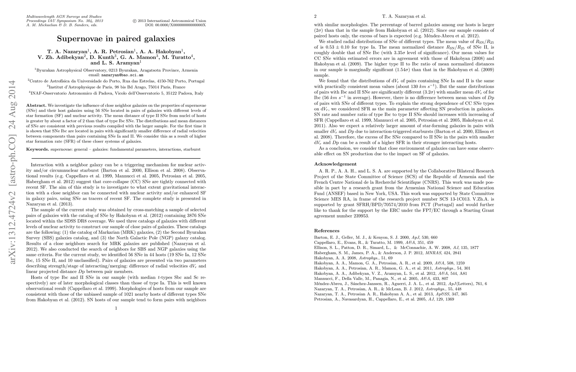 This study examines how neighboring galaxies affect supernovae properties, finding that type II SNe are farther from their host nuclei compared to type Ibc SNe. Notably, SNe Ibc are found in pairs with closer radial velocities, suggesting a higher star formation rate in these systems.
