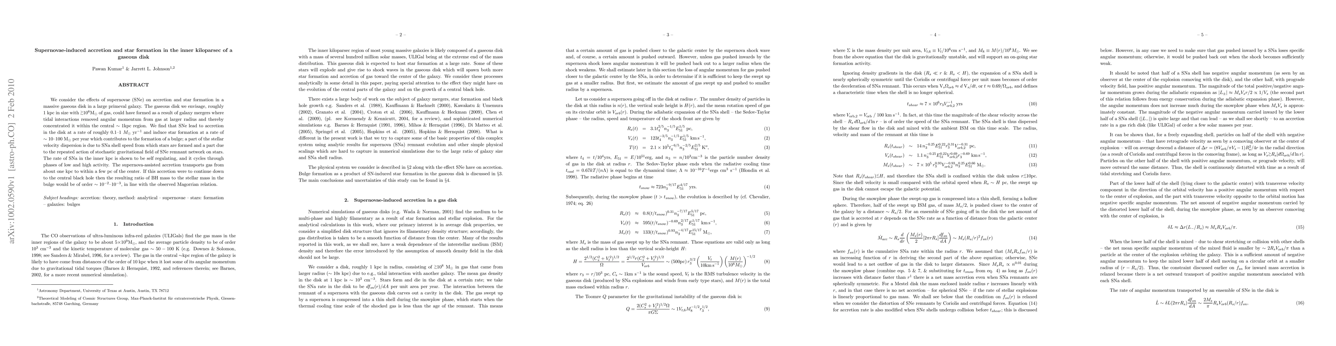 We consider the effects of supernovae (SNe) on accretion and star formation in a massive gaseous disk in a large primeval galaxy. The gaseous disk we envisage, roughly 1 kiloparsec (kpc) in size with >~ 10^8 M_Sun of gas, could have formed as a result of galaxy mergers where tidal interactions removed angular momentum from gas at larger radius and thereby concentrated it within the central ~ 1 kpc region. We find that SNe lead to accretion in the disk at a rate of roughly 0.1 - 1 M_Sun per year and induce star formation at a rate of ~ 10 - 100 M_Sun per year which contributes to the formation of a bulge; a part of the stellar velocity dispersion is due to the speed of SNa shells from which stars are formed and a part due to the repeated action of the stochastic gravitational field of the network of SNa remnants on stars. The rate of SNe in the inner kpc is shown to be self- regulating, and it cycles through phases of low and high activity. The supernova-assisted accretion transports gas from about one kpc to within a few pc of the center. If this accretion were to continue down to the central black hole (BH) then the resulting ratio of BH mass to the stellar mass in the bulge would be of order ~ 10^-2 - 10^-3, in line with the observed Magorrian relation.