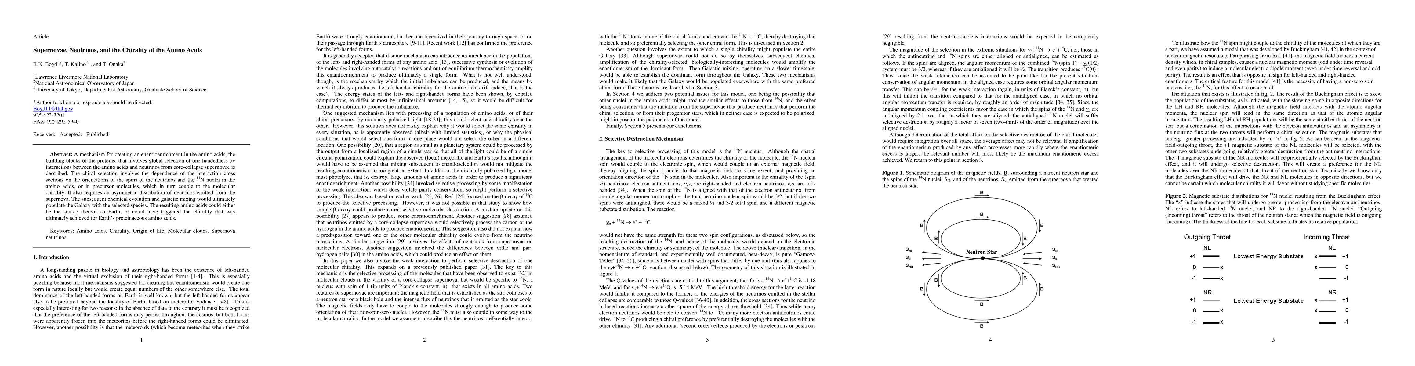This paper proposes a mechanism where core-collapse supernovae emit neutrinos that interact with amino acids, leading to enantioenrichment through spin-dependent cross-sections, and an asymmetric neutrino distribution, potentially explaining the chirality of Earth's amino acids.