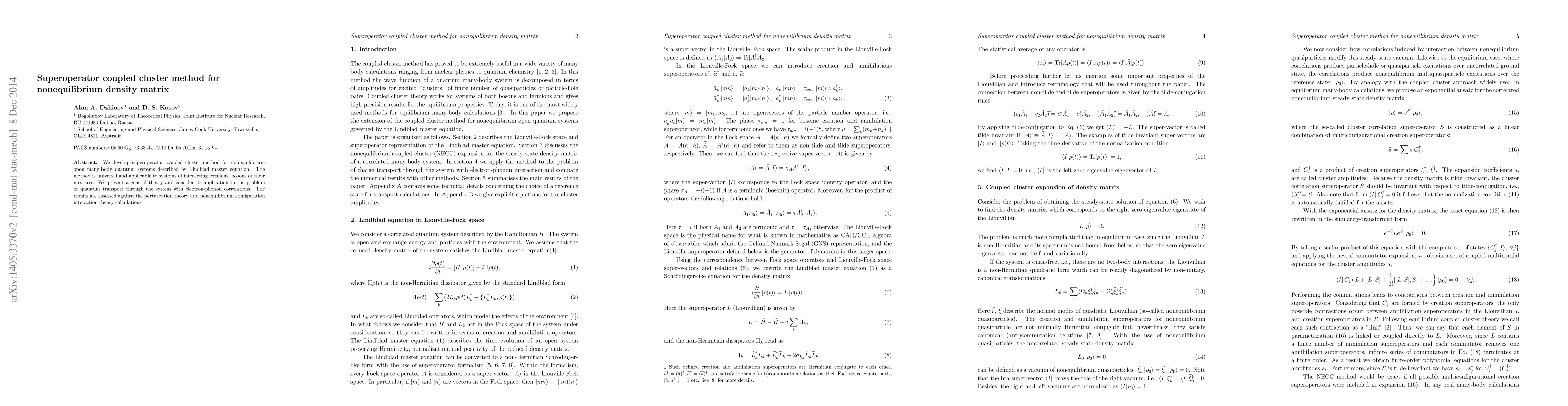 This paper introduces a superoperator coupled cluster method for studying nonequilibrium quantum systems, demonstrating its application to quantum transport with electron-phonon correlations and comparing it to perturbation theory and nonequilibrium configuration interaction.