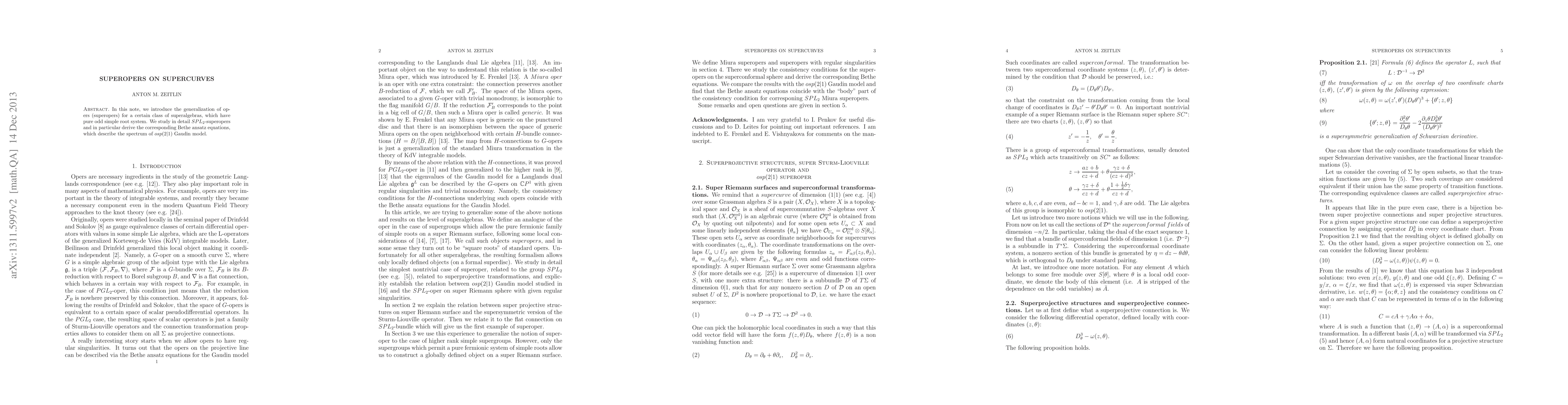 In this note, we introduce the generalization of opers (superopers) for a certain class of superalgebras, which have pure odd simple root system. We study in detail $SPL_2$-superopers and in particular derive the corresponding Bethe ansatz equations, which describe the spectrum of $osp(2|1)$ Gaudin model.