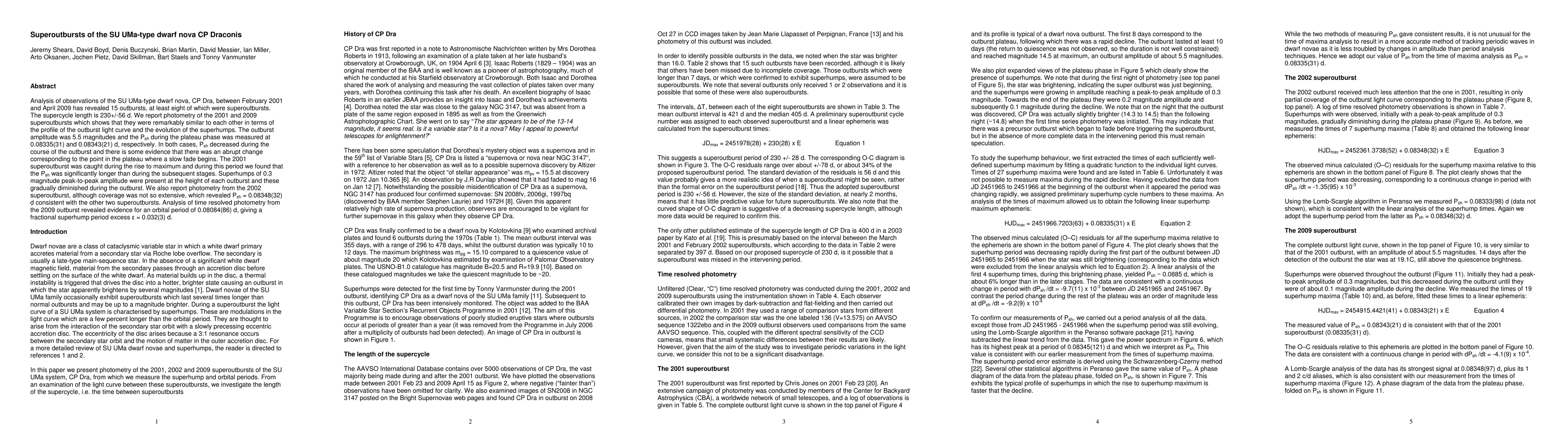 The study of CP Draconis, a SU UMa-type dwarf nova, reveals 15 outbursts from 2001 to 2009, with 8 identified as superoutbursts. The supercycle length is found to be 230+/-56 d. Photometry during superoutbursts in 2001 and 2009 shows similar light curve profiles and superhump evolution. The superhump period (Psh) decreases during the outburst, with an abrupt change corresponding to a slow fade start. Superhumps of 0.3 magnitude peak-to-peak amplitude are observed, diminishing during the outburst. Analysis of the 2002 superoutburst and 2009 time-resolved photometry supports these findings, with Psh measured at 0.08348(32) d and 0.08084(86) d respectively, indicating a fractional superhump period excess.