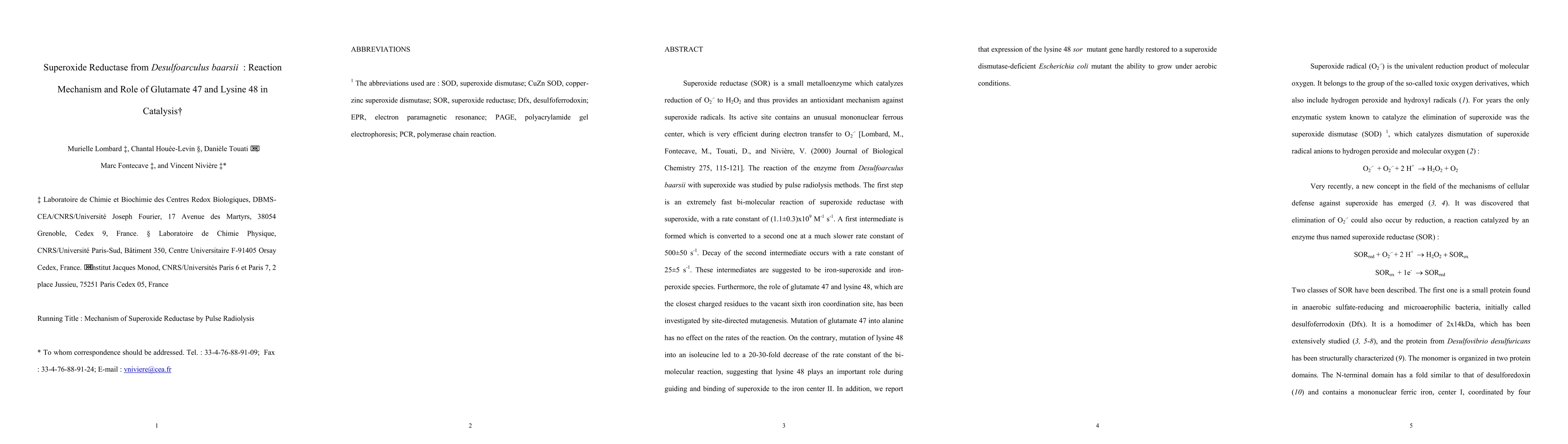 This paper investigates the reaction mechanism of superoxide reductase from Desulfoarculus baarsii, focusing on the catalytic roles of glutamate 47 and lysine 48. The enzyme efficiently reduces superoxide to hydrogen peroxide, and mutagenesis studies show that lysine 48 significantly influences the reaction rate, while glutamate 47 does not.