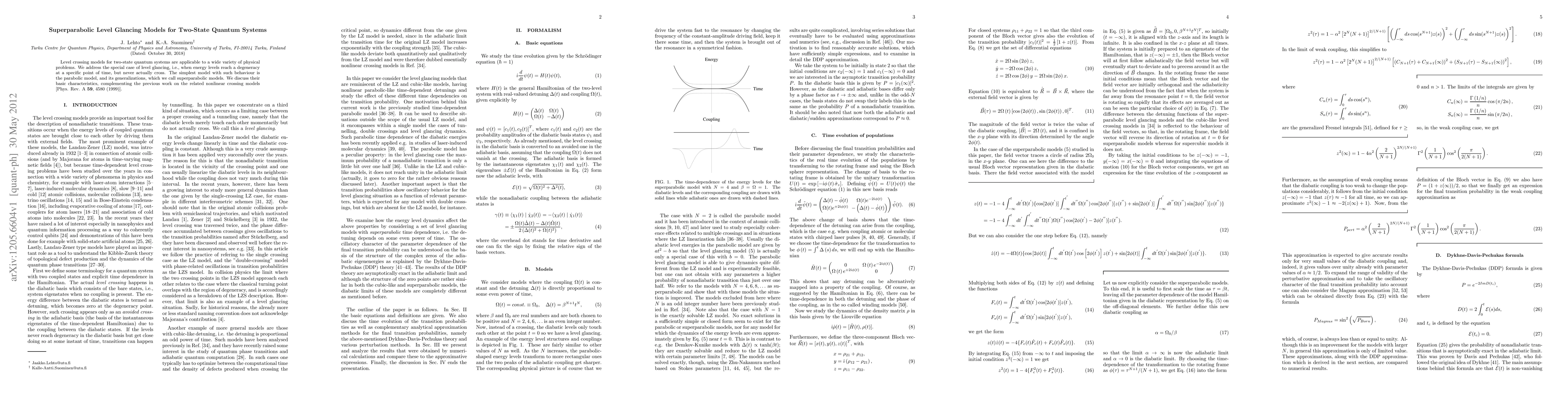 Level crossing models for two-state quantum systems are applicable to a wide variety of physical problems. We address the special case of level glancing, i.e., when energy levels reach a degeneracy at a specific point of time, but never actually cross. The simplest model with such behaviour is the parabolic model, and its generalizations, which we call superparabolic models. We discuss their basic characteristics, complementing the previous work on the related nonlinear crossing models [Phys. Rev. A 59, 4580 (1999)].