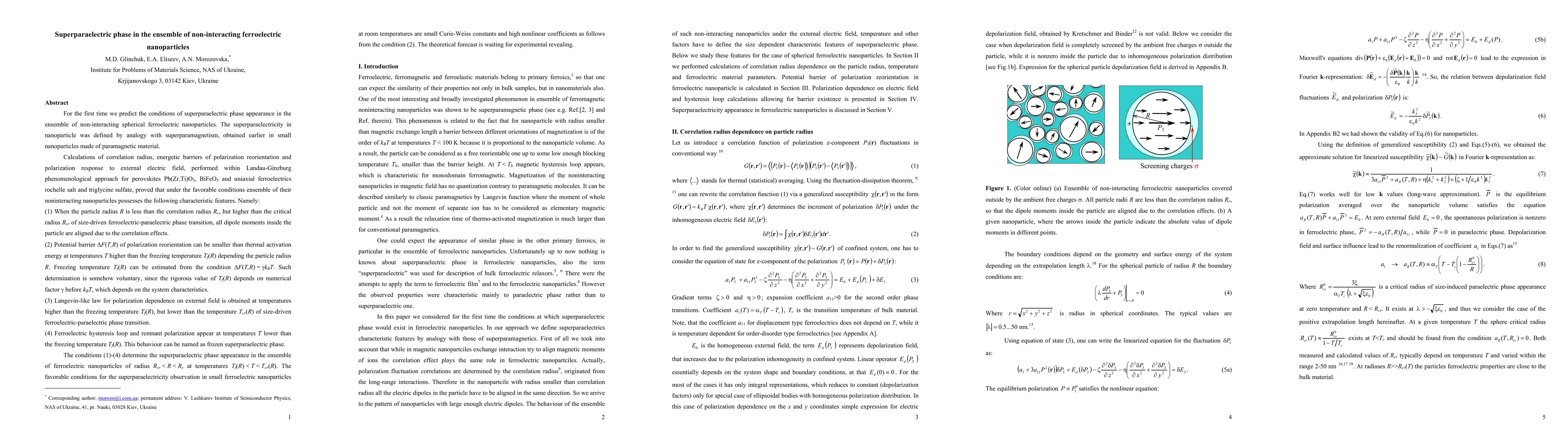 This research introduces the concept of a superparaelectric phase in ensembles of non-interacting ferroelectric nanoparticles, analogous to superparamagnetism in small paramagnetic nanoparticles. Calculations using Landau-Ginzburg theory for materials like Pb(Zr,Ti)O3, BiFeO3, rochelle salt, and triglycine sulfate, reveal correlation radii, energy barriers, and polarization responses to electric fields.