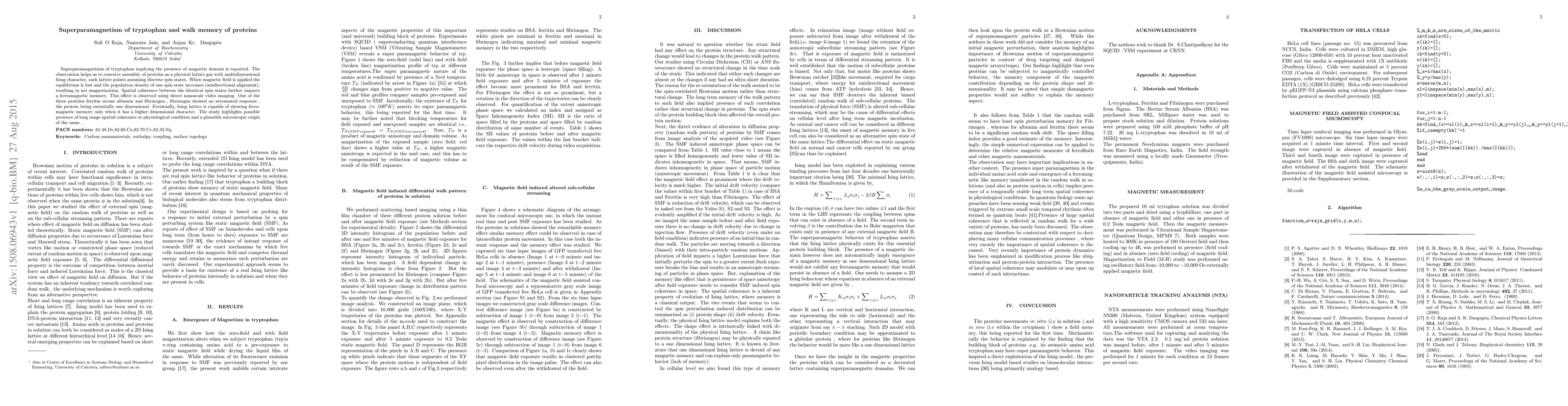 Superparamagnetism of tryptophan implying the presence of magnetic domain is reported. The observation helps us to conceive assembly of proteins as a physical lattice gas with multidimensional Ising character, each lattice points assuming discrete spin states. When magnetic field is applied the equilibrium is lost and the population density of one spin state increases (unidirectional alignment), resulting in net magnetization. Spatial coherence between the identical spin states further imparts a ferromagnetic memory. This effect is observed using direct nanoscale video imaging. Out of the three proteins ferritin serum albumin and fibrinogen, fibrinogen showed an attenuated response, the protein being essentially one dimensional. Eventually, Ising lattice is capable of showing ferromagnetic memory only when it has a higher dimensional character. The study highlights possible presence of long range spatial coherence at physiological condition and a plausible microscopic origin of the same.