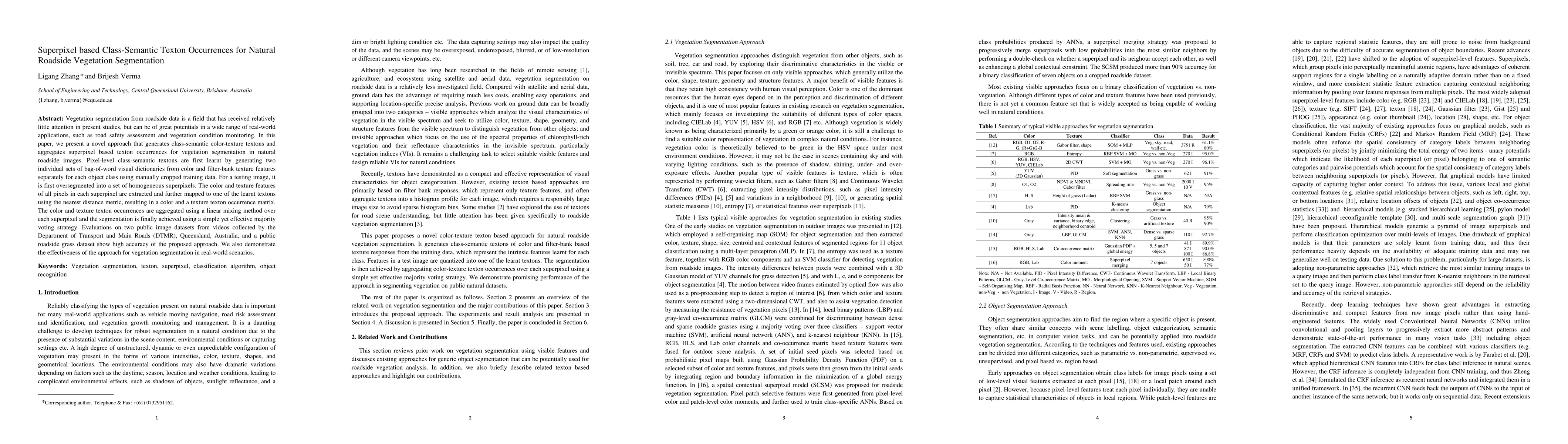 This paper introduces a novel method for segmenting natural roadside vegetation using class-semantic texton occurrences and superpixel aggregation. The approach learns pixel-level textons from color and texture features and segments images using a majority voting strategy, achieving high accuracy on public datasets.