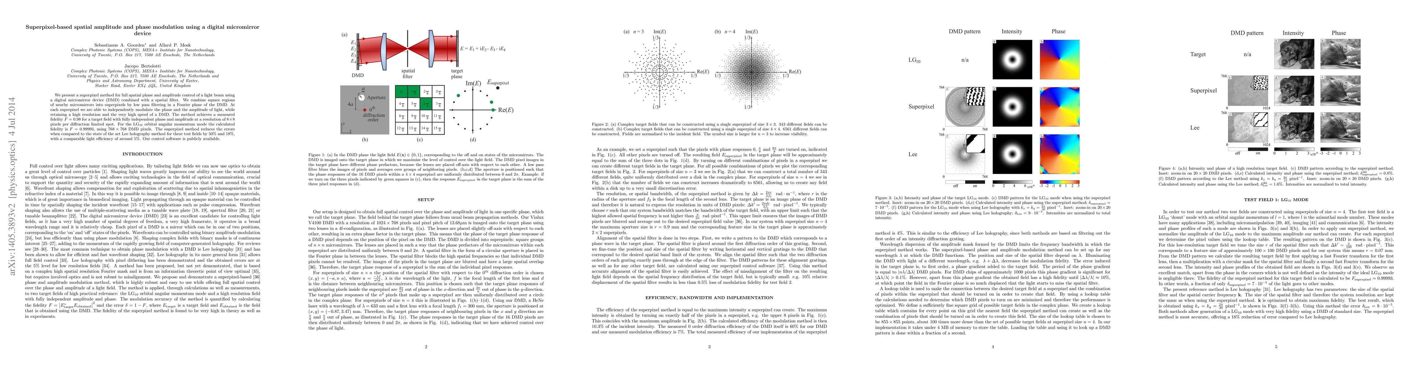 This paper introduces a superpixel method for precise spatial phase and amplitude modulation of light beams using a digital micromirror device (DMD), achieving high fidelity and resolution. The method reduces errors by 50% and 18% compared to the Lee holography method, while maintaining light efficiency.