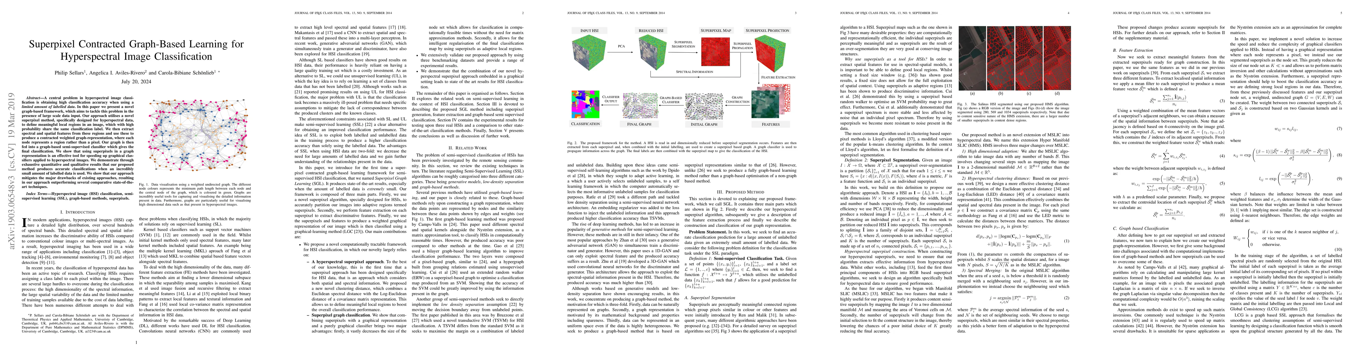 This paper introduces a novel graph-based framework for hyperspectral image classification using limited labelled data. It employs a superpixel method to define meaningful local regions, extracts features, and constructs a contracted weighted graph for classification, achieving high accuracy and outperforming state-of-the-art techniques.