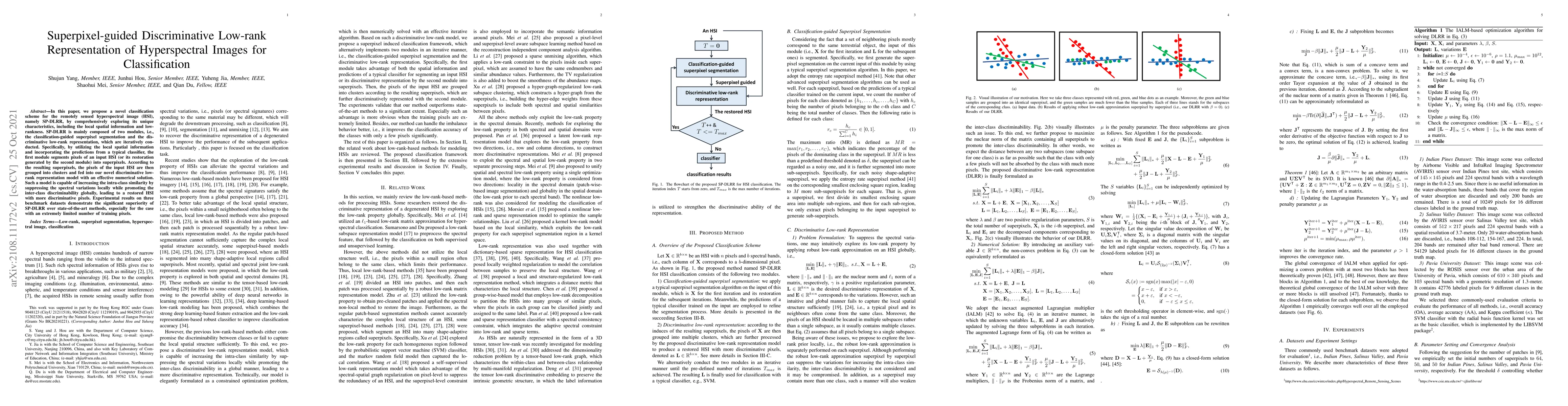 In this paper, we propose a novel classification scheme for the remotely sensed hyperspectral image (HSI), namely SP-DLRR, by comprehensively exploring its unique characteristics, including the local spatial information and low-rankness. SP-DLRR is mainly composed of two modules, i.e., the classification-guided superpixel segmentation and the discriminative low-rank representation, which are iteratively conducted. Specifically, by utilizing the local spatial information and incorporating the predictions from a typical classifier, the first module segments pixels of an input HSI (or its restoration generated by the second module) into superpixels. According to the resulting superpixels, the pixels of the input HSI are then grouped into clusters and fed into our novel discriminative low-rank representation model with an effective numerical solution. Such a model is capable of increasing the intra-class similarity by suppressing the spectral variations locally while promoting the inter-class discriminability globally, leading to a restored HSI with more discriminative pixels. Experimental results on three benchmark datasets demonstrate the significant superiority of SP-DLRR over state-of-the-art methods, especially for the case with an extremely limited number of training pixels.
