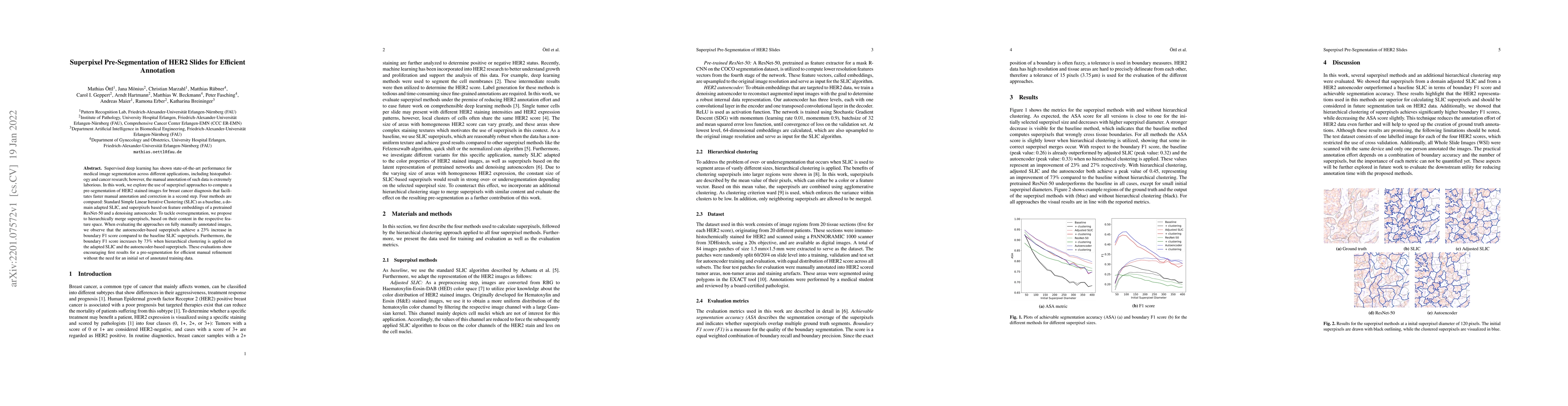 Supervised deep learning has shown state-of-the-art performance for medical image segmentation across different applications, including histopathology and cancer research; however, the manual annotation of such data is extremely laborious. In this work, we explore the use of superpixel approaches to compute a pre-segmentation of HER2 stained images for breast cancer diagnosis that facilitates faster manual annotation and correction in a second step. Four methods are compared: Standard Simple Linear Iterative Clustering (SLIC) as a baseline, a domain adapted SLIC, and superpixels based on feature embeddings of a pretrained ResNet-50 and a denoising autoencoder. To tackle oversegmentation, we propose to hierarchically merge superpixels, based on their content in the respective feature space. When evaluating the approaches on fully manually annotated images, we observe that the autoencoder-based superpixels achieve a 23% increase in boundary F1 score compared to the baseline SLIC superpixels. Furthermore, the boundary F1 score increases by 73% when hierarchical clustering is applied on the adapted SLIC and the autoencoder-based superpixels. These evaluations show encouraging first results for a pre-segmentation for efficient manual refinement without the need for an initial set of annotated training data.