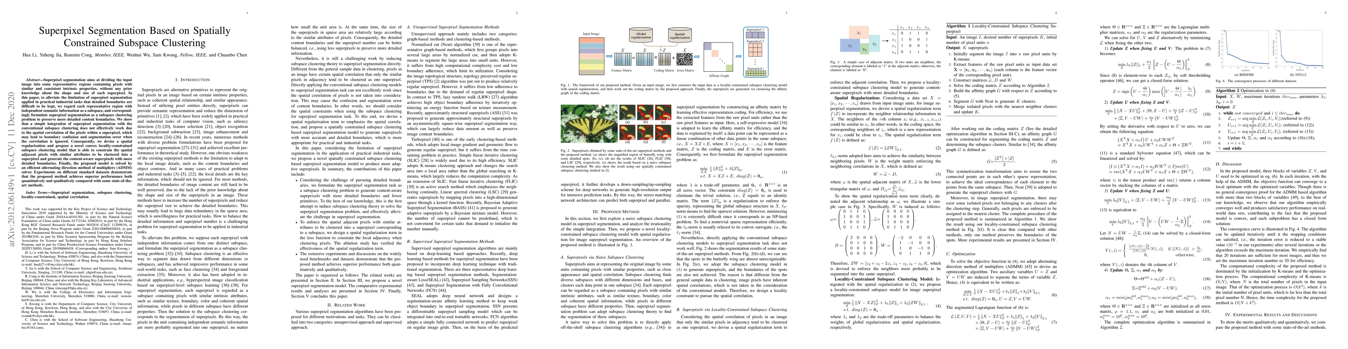 This paper proposes a spatially constrained subspace clustering model for superpixel segmentation that integrates spatial regularization to generate superpixels with more detailed boundaries. The method is solved using an efficient alternating direction method of multipliers (ADMM) solver, achieving superior performance compared to state-of-the-art methods in both quantitative and qualitative evaluations.