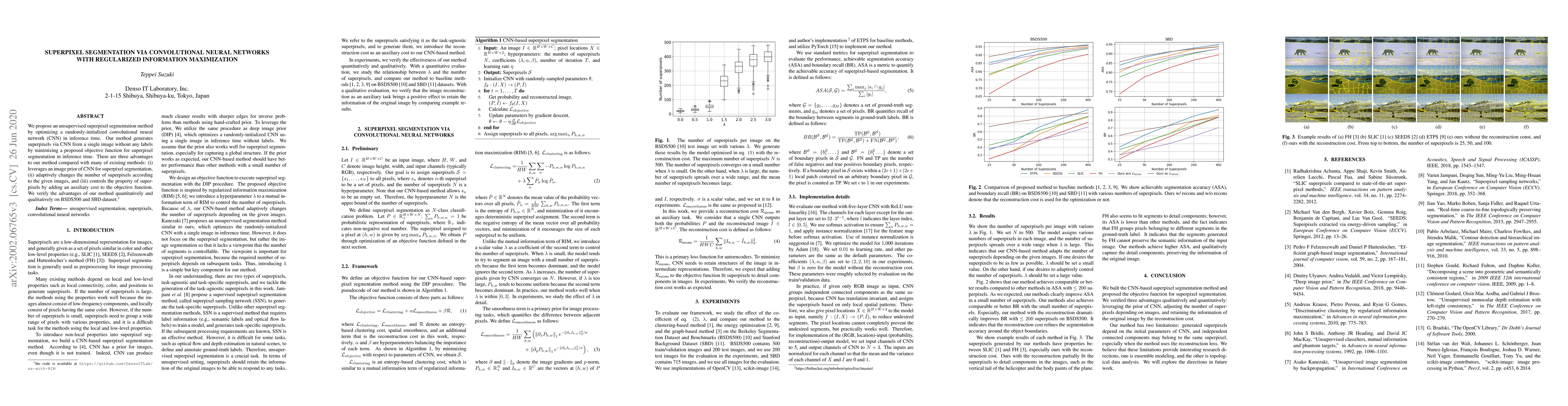 The paper introduces a CNN-based superpixel segmentation method with an objective function that includes clustering, smoothness, and a reconstruction cost, allowing adaptive superpixel number and improved image information retention.