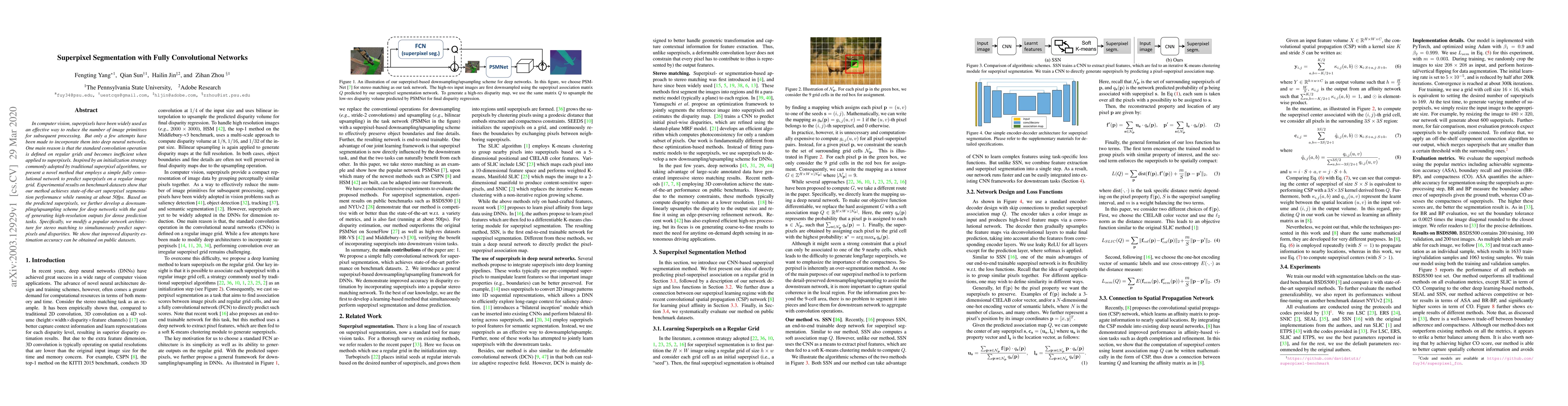 This paper proposes a fully convolutional network for efficient superpixel segmentation, achieving state-of-the-art performance at 50fps. The method integrates superpixels into deep learning by predicting them on a regular grid, and it enhances dense prediction tasks through a downsampling/upsampling scheme.