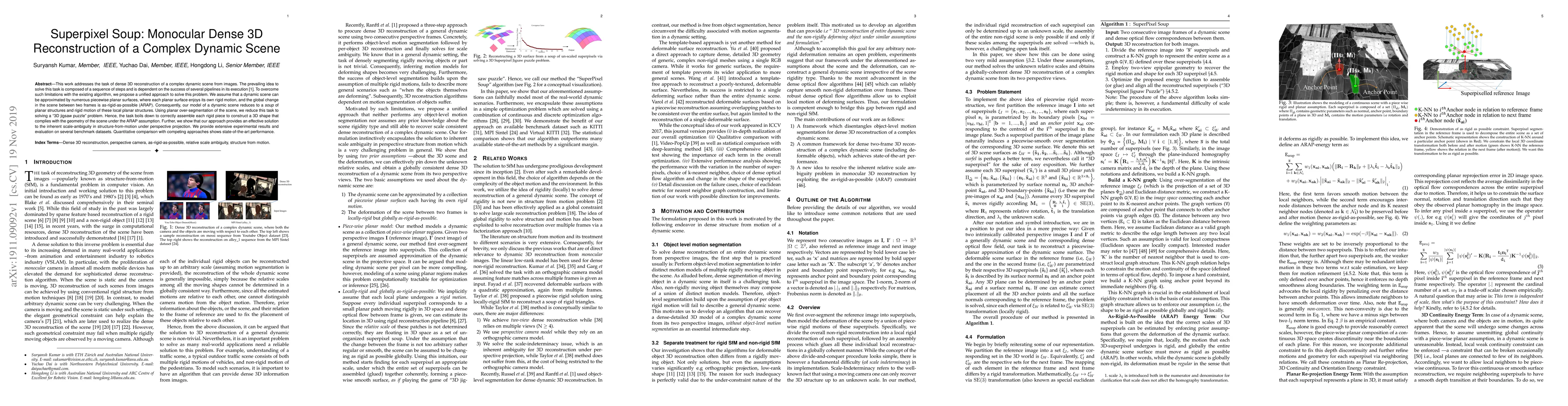 This paper proposes a unified approach for dense 3D reconstruction of dynamic scenes by segmenting the scene into piecewise planar surfaces and solving a "3D jigsaw puzzle." The method effectively addresses scale-ambiguity in structure-from-motion and achieves state-of-the-art performance according to experimental results.