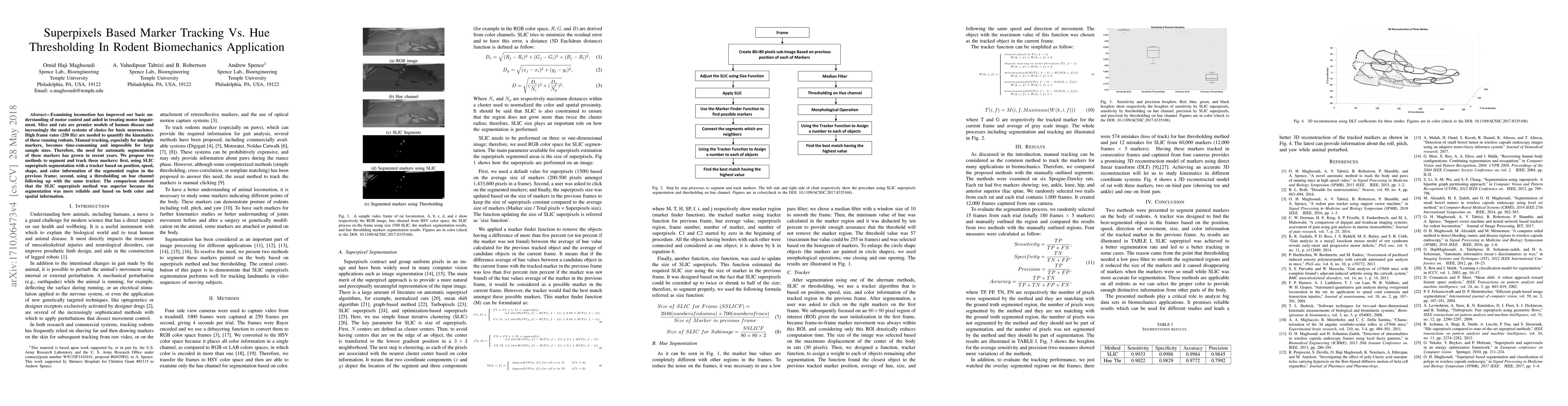 Examining locomotion has improved our basic understanding of motor control and aided in treating motor impairment. Mice and rats are premier models of human disease and increasingly the model systems of choice for basic neuroscience. High frame rates (250 Hz) are needed to quantify the kinematics of these running rodents. Manual tracking, especially for multiple markers, becomes time-consuming and impossible for large sample sizes. Therefore, the need for automatic segmentation of these markers has grown in recent years. We propose two methods to segment and track these markers: first, using SLIC superpixels segmentation with a tracker based on position, speed, shape, and color information of the segmented region in the previous frame; second, using a thresholding on hue channel following up with the same tracker. The comparison showed that the SLIC superpixels method was superior because the segmentation was more reliable and based on both color and spatial information.