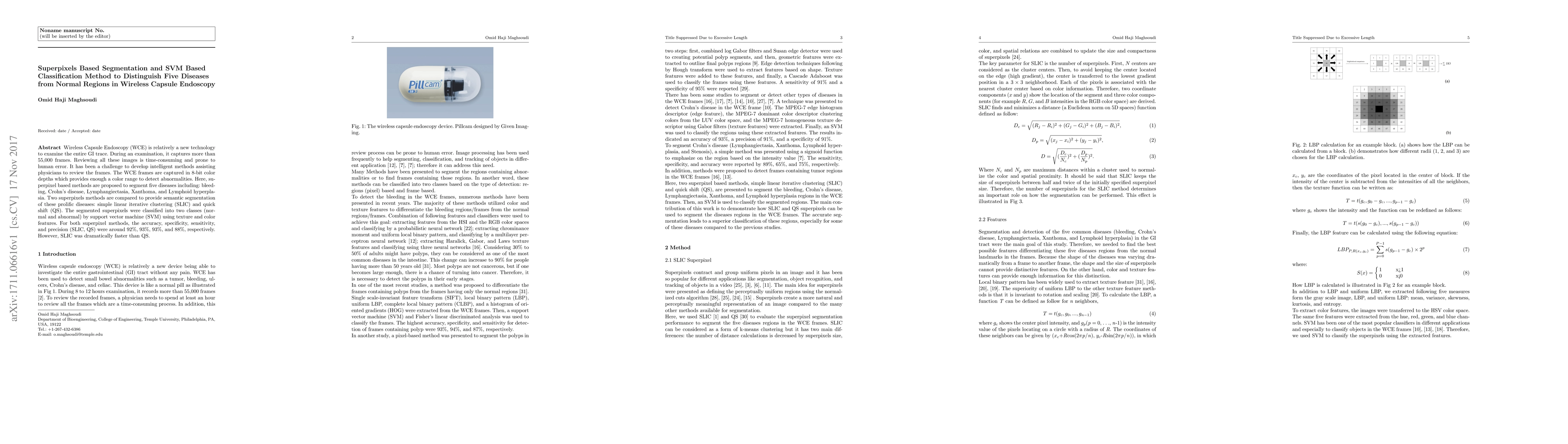 This paper proposes a method using superpixel segmentation (SLIC and QS) to identify five GI diseases in Wireless Capsule Endoscopy images, followed by SVM classification based on texture and color features. The method achieves high accuracy (~92%) and is significantly faster with SLIC compared to QS.