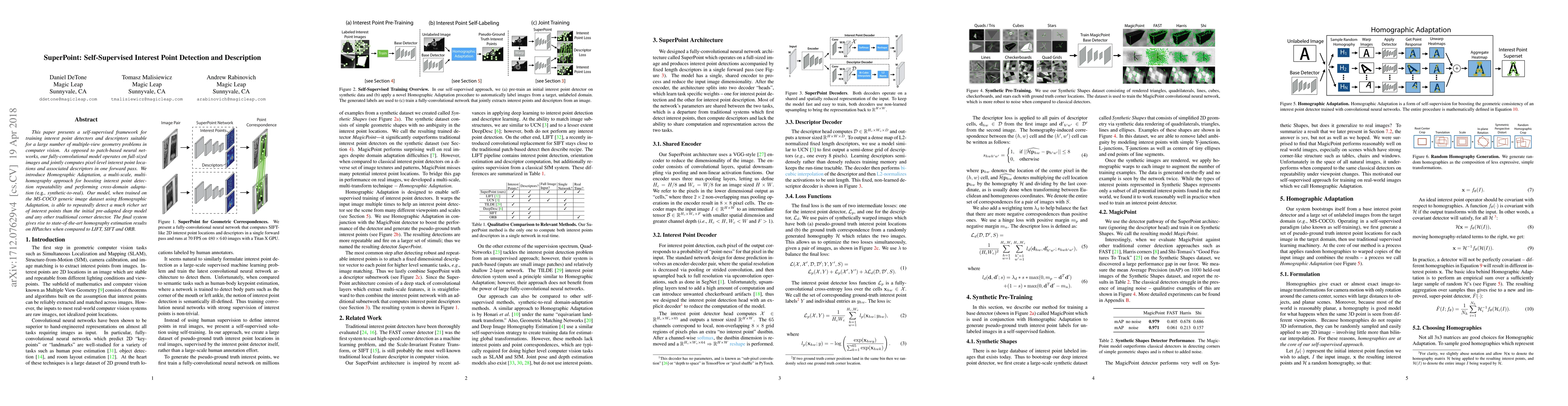 This paper introduces a self-supervised framework for training interest point detectors and descriptors using a fully-convolutional model that operates on full-sized images. The proposed Homographic Adaptation method enhances detection repeatability and cross-domain adaptation, achieving state-of-the-art homography estimation results compared to traditional methods.