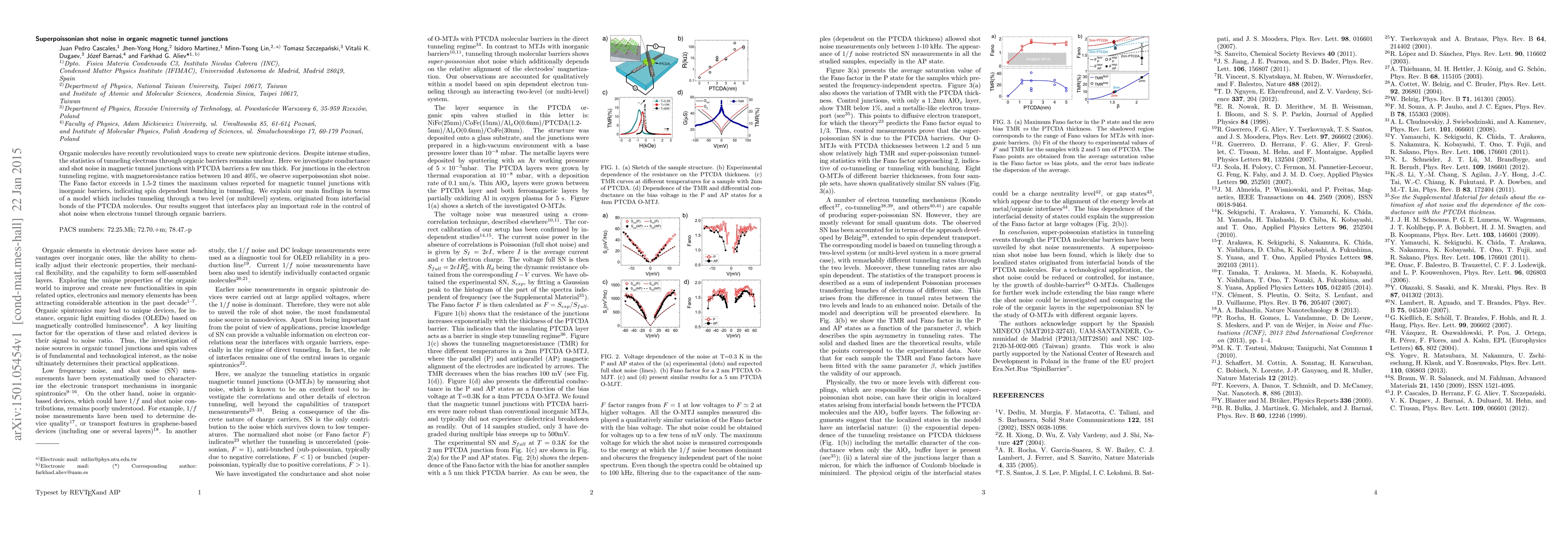 This paper investigates the conductance and shot noise in organic magnetic tunnel junctions with PTCDA barriers, finding superpoissonian shot noise with a Fano factor exceeding typical values by 1.5-2 times. The study suggests that spin-dependent bunching and interfacial bonds in the PTCDA molecules contribute to the observed noise, highlighting the role of interfaces in controlling shot noise in organic barriers.