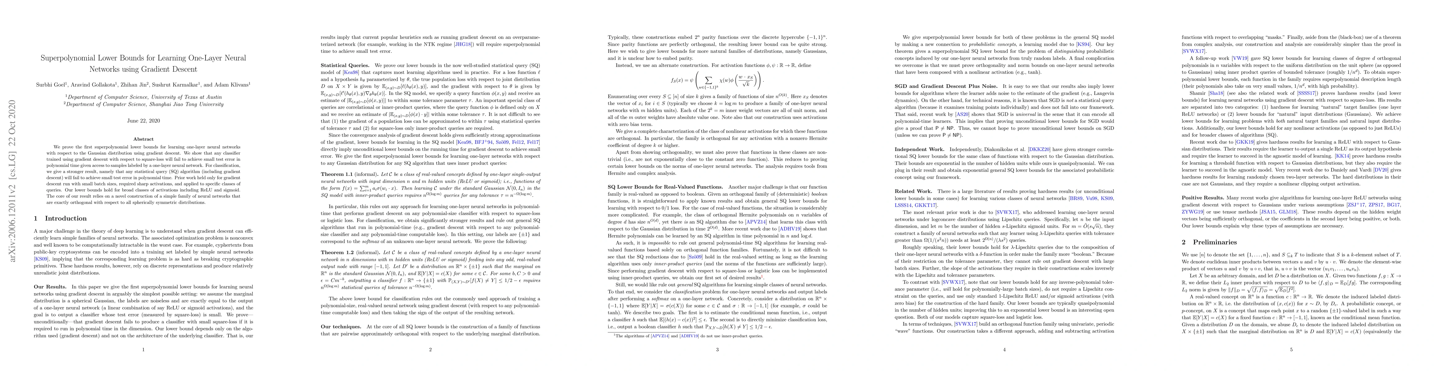 This paper establishes the first superpolynomial lower bounds for learning one-layer neural networks using gradient descent, demonstrating that gradient descent cannot achieve small test error in polynomial time for broad classes of activations, including ReLU and sigmoid. The findings extend beyond gradient descent to all statistical query algorithms.