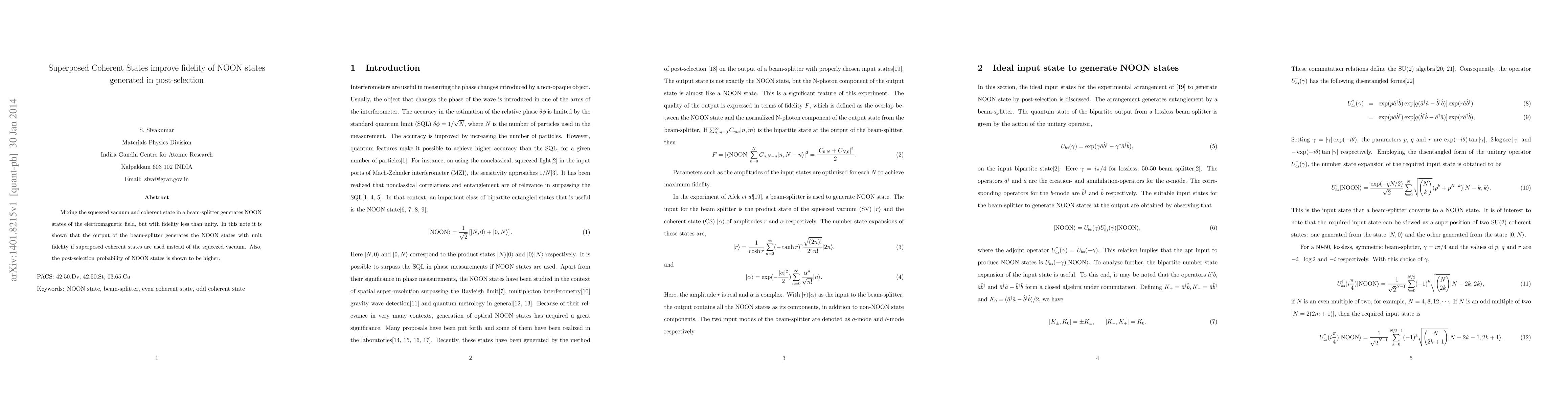 This paper demonstrates that using superposed coherent states instead of squeezed vacuum in a beam-splitter enhances the fidelity of generated NOON states to unity, and increases the post-selection probability of these states.