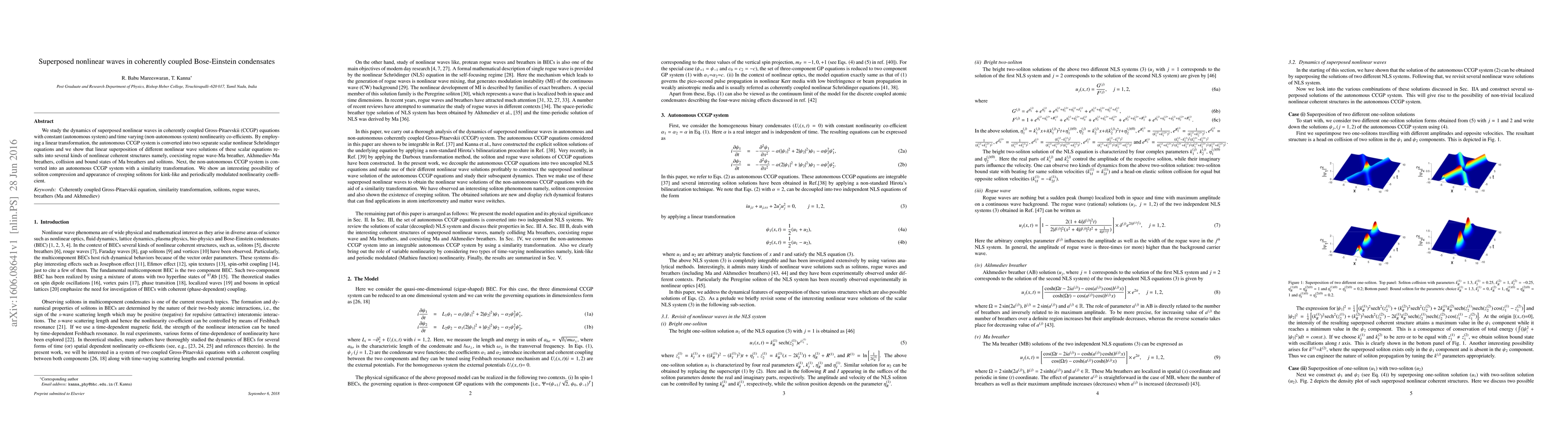 This paper investigates the dynamics of superposed nonlinear waves in coherently coupled Gross-Pitaevskii equations, revealing various nonlinear coherent structures from linear superpositions, and explores soliton compression and creeping solitons in time-varying nonlinearity scenarios.