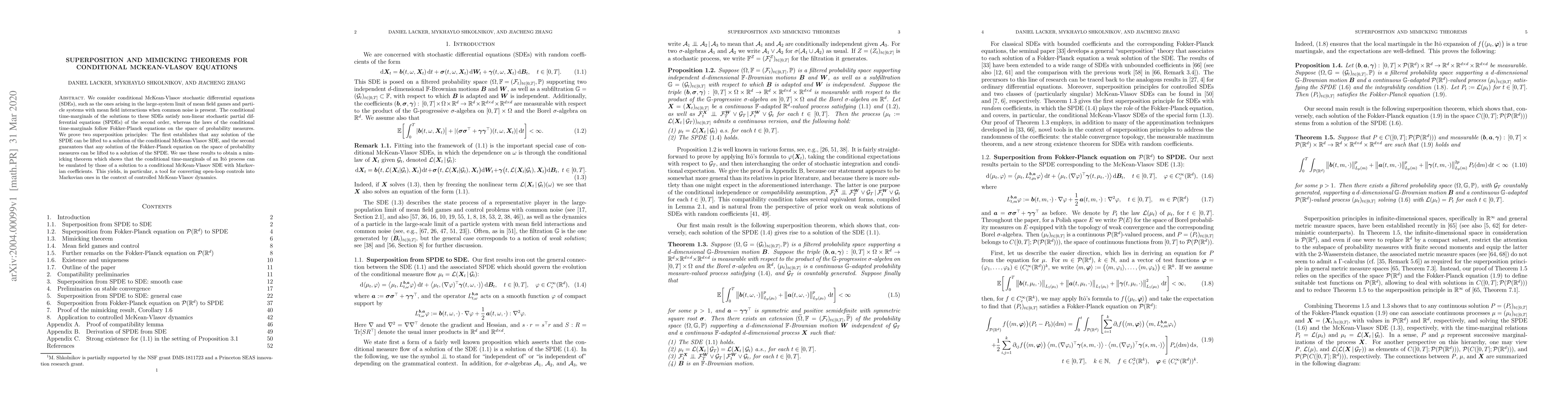 We consider conditional McKean-Vlasov stochastic differential equations (SDEs), such as the ones arising in the large-system limit of mean field games and particle systems with mean field interactions when common noise is present. The conditional time-marginals of the solutions to these SDEs satisfy non-linear stochastic partial differential equations (SPDEs) of the second order, whereas the laws of the conditional time-marginals follow Fokker-Planck equations on the space of probability measures. We prove two superposition principles: The first establishes that any solution of the SPDE can be lifted to a solution of the conditional McKean-Vlasov SDE, and the second guarantees that any solution of the Fokker-Planck equation on the space of probability measures can be lifted to a solution of the SPDE. We use these results to obtain a mimicking theorem which shows that the conditional time-marginals of an Ito process can be emulated by those of a solution to a conditional McKean-Vlasov SDE with Markovian coefficients. This yields, in particular, a tool for converting open-loop controls into Markovian ones in the context of controlled McKean-Vlasov dynamics.