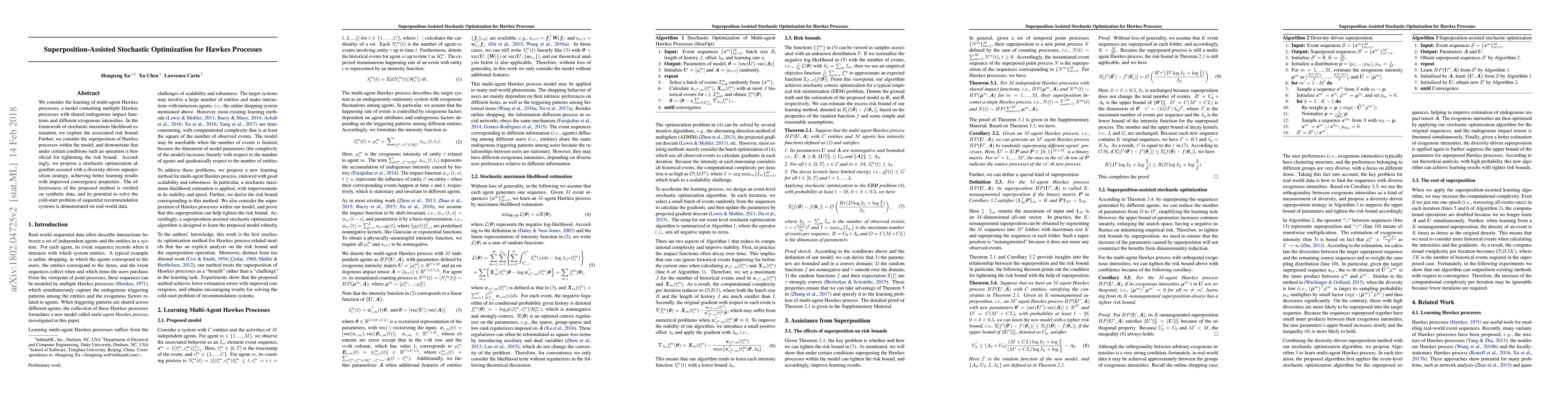 We consider the learning of multi-agent Hawkes processes, a model containing multiple Hawkes processes with shared endogenous impact functions and different exogenous intensities. In the framework of stochastic maximum likelihood estimation, we explore the associated risk bound. Further, we consider the superposition of Hawkes processes within the model, and demonstrate that under certain conditions such an operation is beneficial for tightening the risk bound. Accordingly, we propose a stochastic optimization algorithm assisted with a diversity-driven superposition strategy, achieving better learning results with improved convergence properties. The effectiveness of the proposed method is verified on synthetic data, and its potential to solve the cold-start problem of sequential recommendation systems is demonstrated on real-world data.