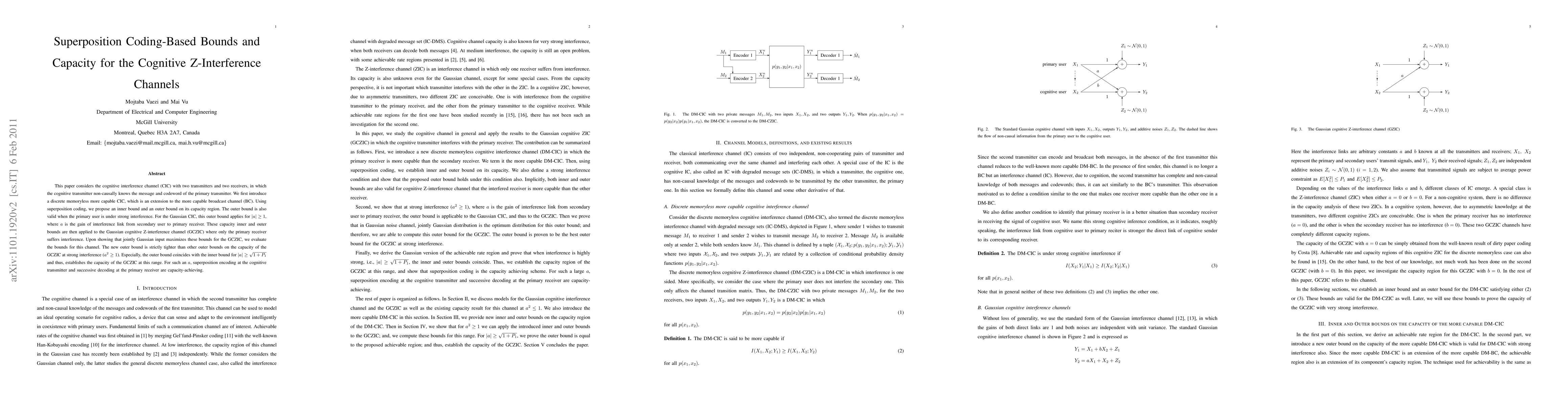 This paper proposes inner and outer bounds for the capacity of the cognitive Z-interference channel (GCZIC) using superposition coding, showing that jointly Gaussian inputs maximize these bounds. The new outer bound is tighter than previous bounds for strong interference, establishing capacity for $|a| \geq \sqrt{1 + P_1}$ where $a$ is the interference gain.