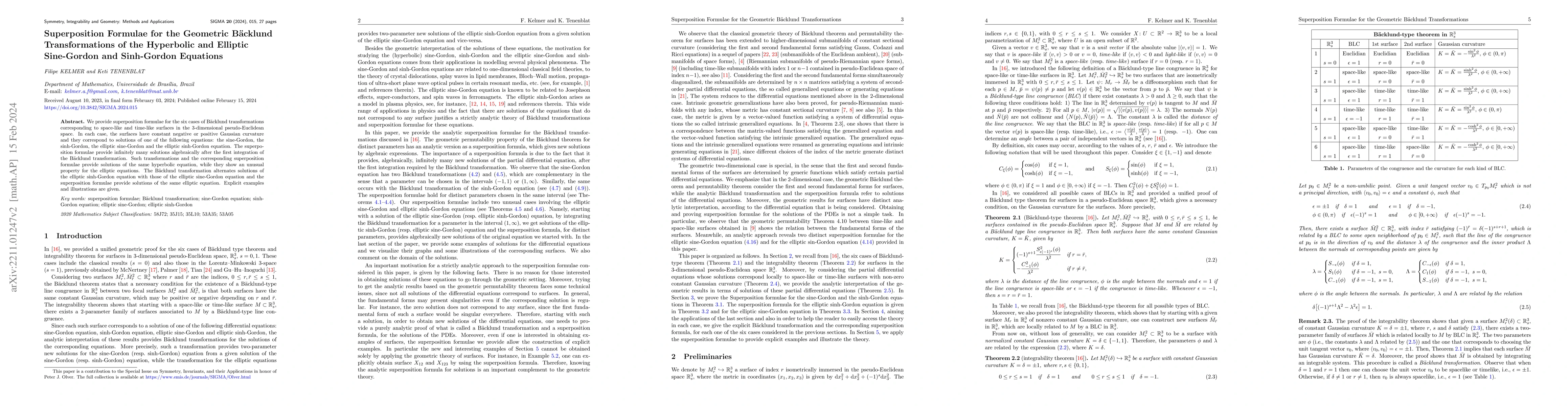 We provide superposition formulae for the six cases of B\"acklund transformations corresponding to space-like and time-like surfaces in the 3-dimensional pseudo-Euclidean space. In each case, the surfaces have constant negative or positive Gaussian curvature and they correspond to solutions of one of the following equations: the sine-Gordon, the sinh-Gordon, the elliptic sine-Gordon and the elliptic sinh-Gordon equation. The superposition formulae provide infinitely many solutions algebraically after the first integration of the B\"acklund transformation. Such transformations and the corresponding superposition formulae provide solutions of the same hyperbolic equation, while they show an unusual property for the elliptic equations. The B\"acklund transformation alternates solutions of the elliptic sinh-Gordon equation with those of the elliptic sine-Gordon equation and the superposition formulae provide solutions of the same elliptic equation. Explicit examples and illustrations are given.