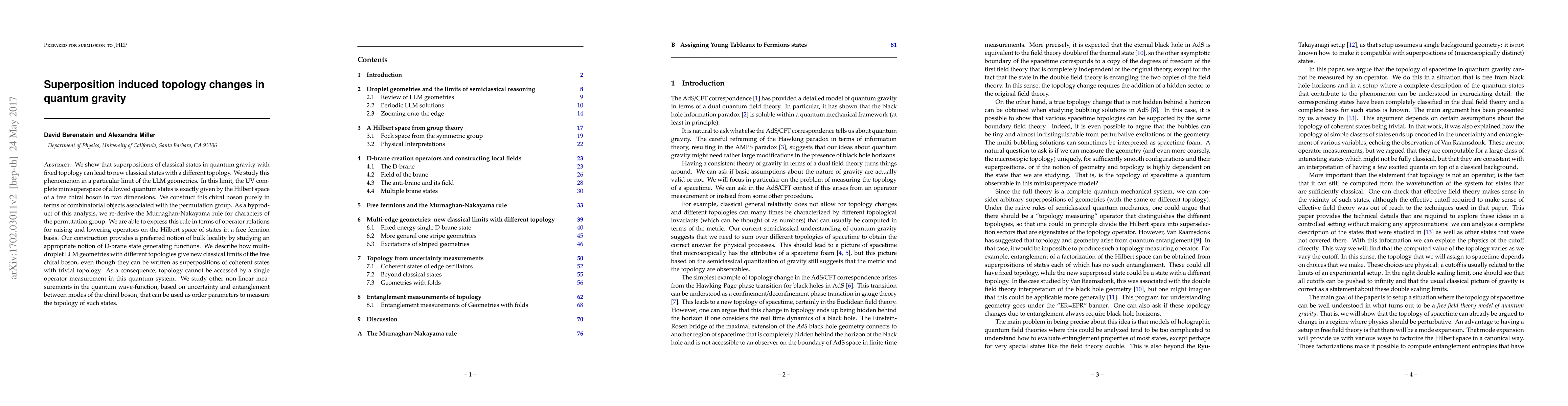 This paper demonstrates that superpositions in quantum gravity can induce topology changes in classical states, using LLM geometries in a specific limit. It constructs a chiral boson in terms of combinatorial objects and derives the Murnaghan-Nakayama rule, showing that topology cannot be accessed by single operator measurements but can be inferred through non-linear measurements of entanglement and uncertainty.