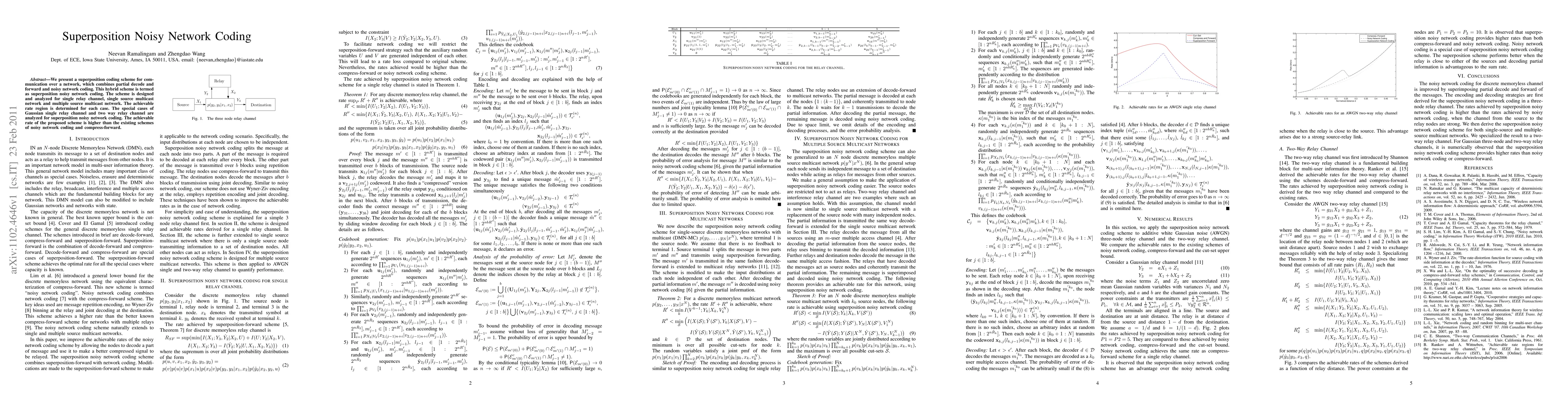 Superposition noisy network coding combines partial decode-forward and noisy network coding for enhanced communication efficiency, achieving higher rates than existing methods in various network settings, including single relay, multicast, and Gaussian relay channels.