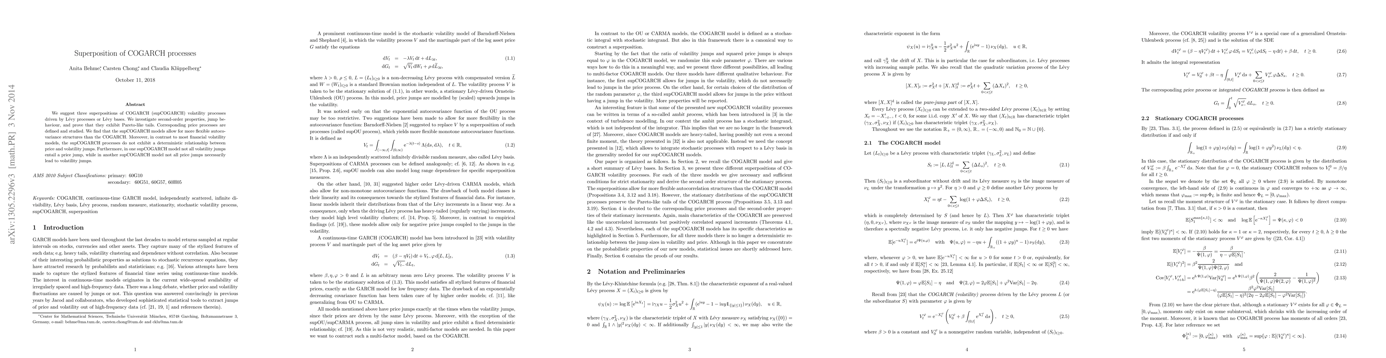 This paper proposes three superpositions of COGARCH volatility processes driven by Lévy processes, examining their second-order properties and jump behavior. The models exhibit Pareto-like tails and flexible autocovariance structures, with no deterministic link between price and volatility jumps in most cases.
