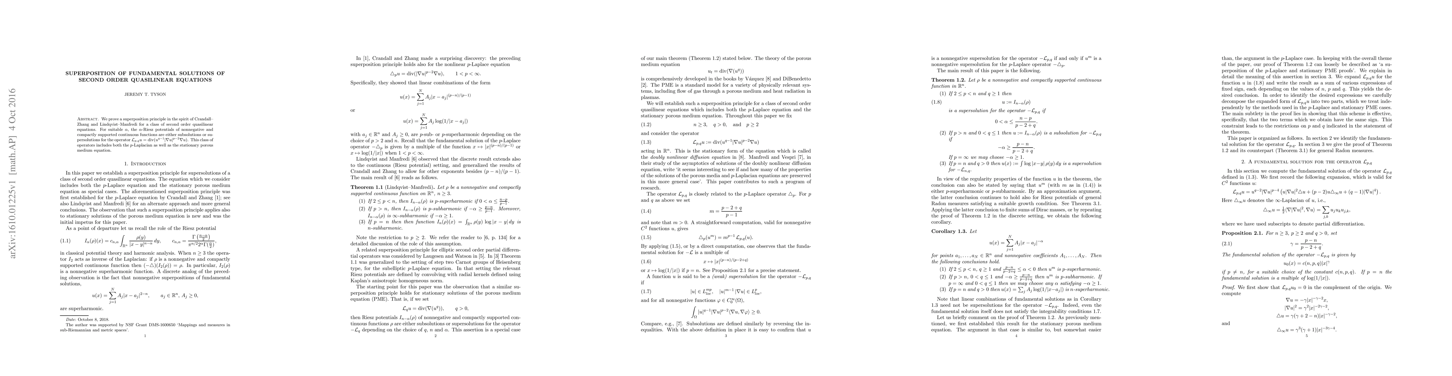 We prove a superposition principle in the spirit of Crandall-Zhang and Lindqvist-Manfredi for a class of second order quasilinear equations. Riesz potentials of nonnegative and compactly supported continuous functions are either subsolutions or supersolutions for the operators associated to the stationary form of the doubly nonlinear diffusion equation. This class of operators includes both the p-Laplacian as well as the stationary porous medium equation.
