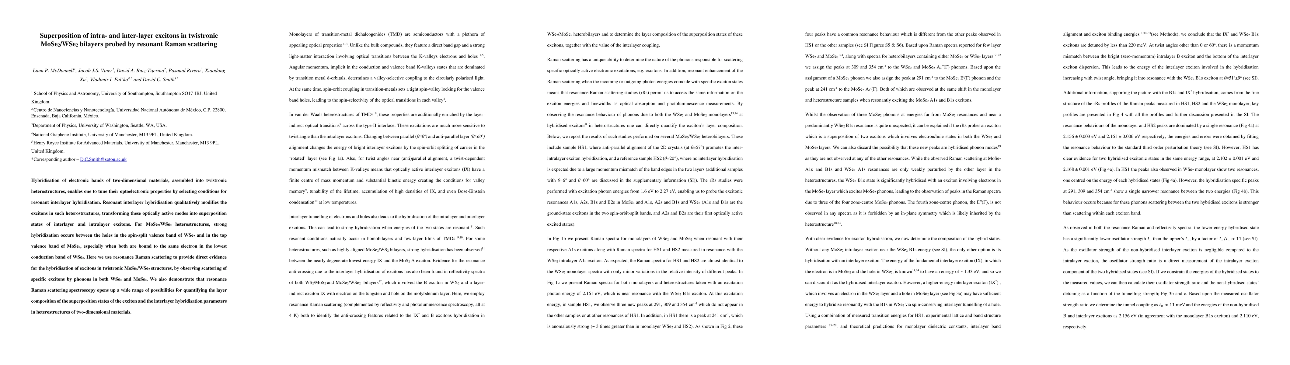 The paper investigates the superposition of intra- and inter-layer excitons in twistronic MoSe$_2$/WSe$_2$ bilayers using resonant Raman scattering, providing direct evidence of exciton hybridisation and demonstrating the technique's potential for quantifying layer composition and hybridisation parameters.