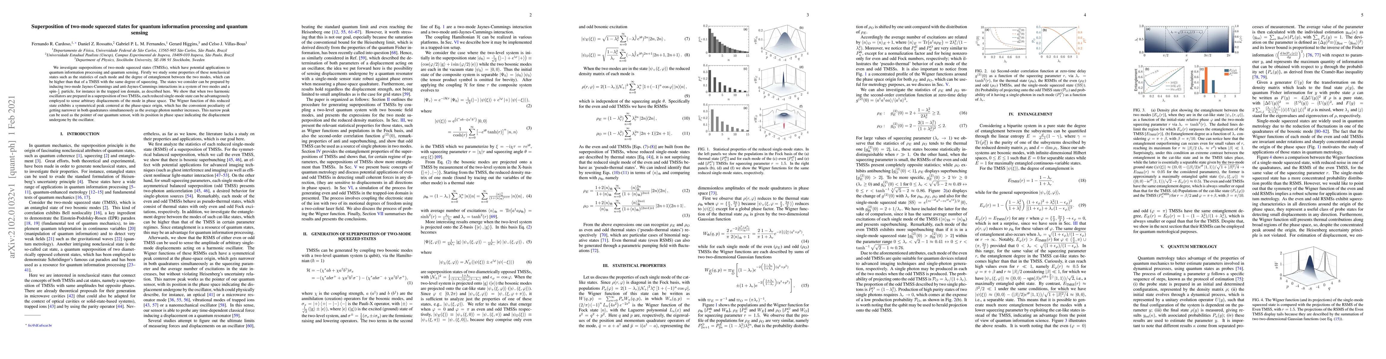 This paper explores superpositions of two-mode squeezed states (TMSSs) for quantum information processing and sensing, highlighting their enhanced entanglement and potential for precise displacement measurements. The study reveals that these states, prepared via specific interactions in a trapped ion system, exhibit a symmetrical peak in the Wigner function that narrows with increased photon number, serving as an effective quantum sensor pointer.